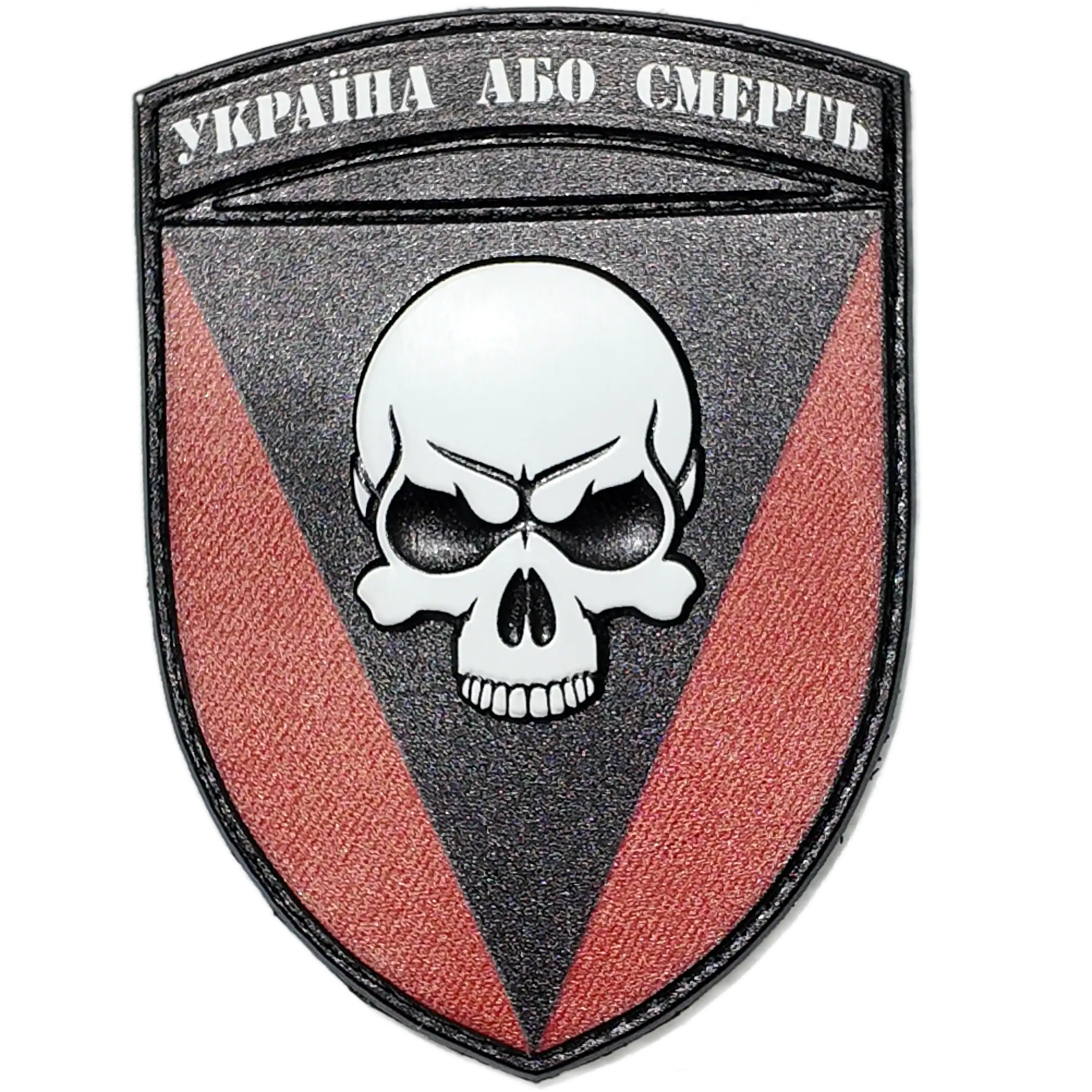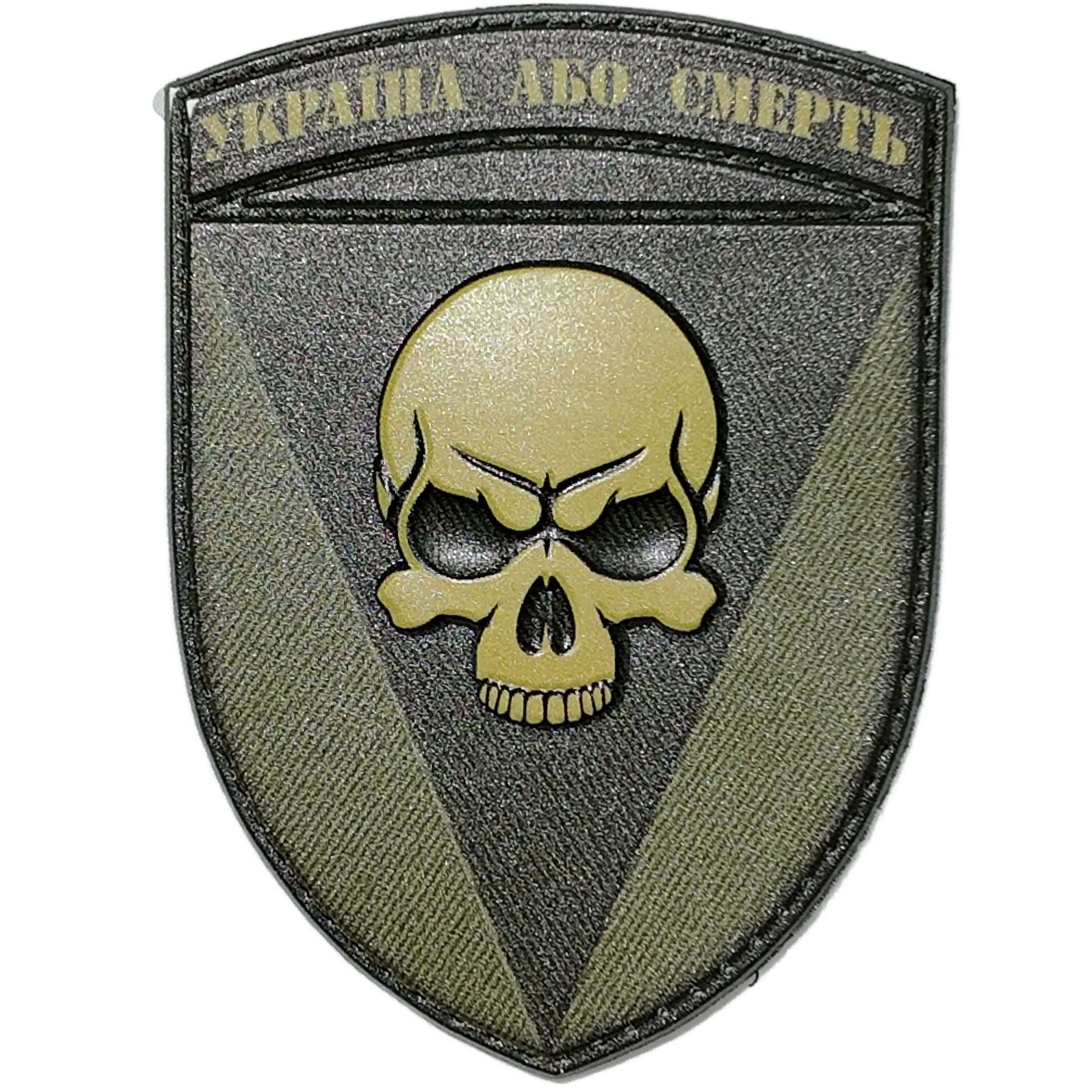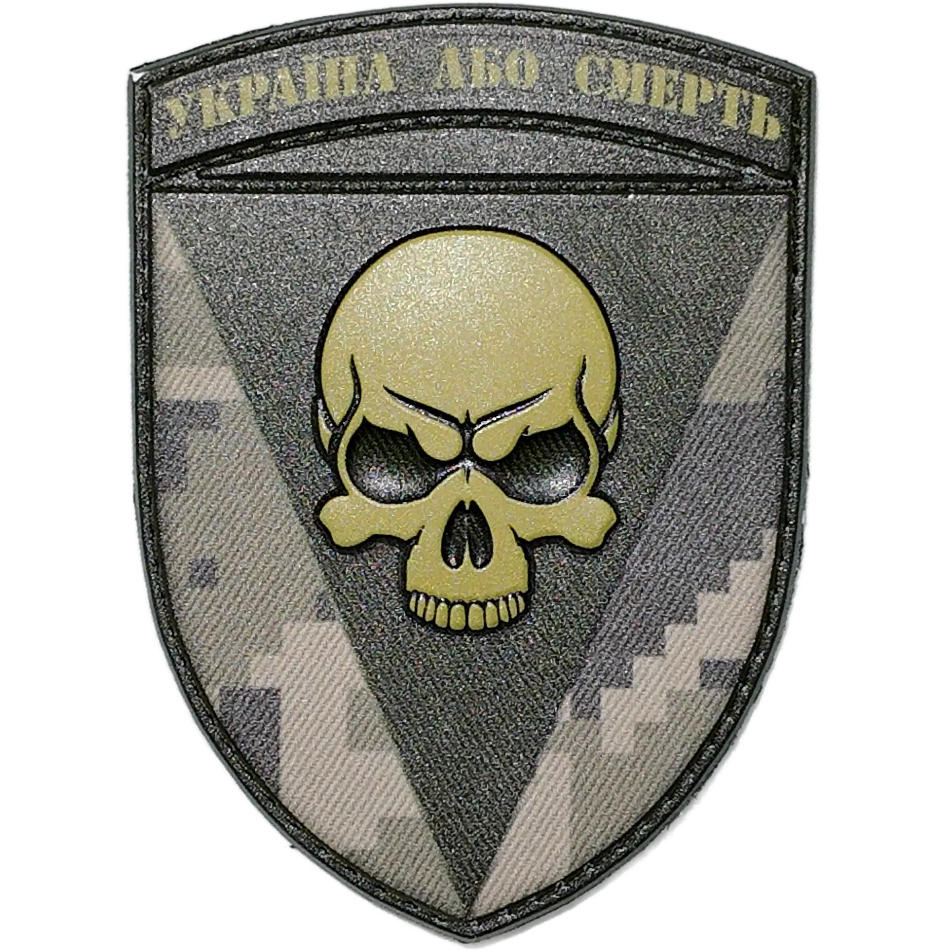 The design prominently features a skull emblem set against a black triangle, accompanied by the motto “Україна або смерть” (“Ukraine or Death”), reflecting the brigade’s fierce determination and historical roots.