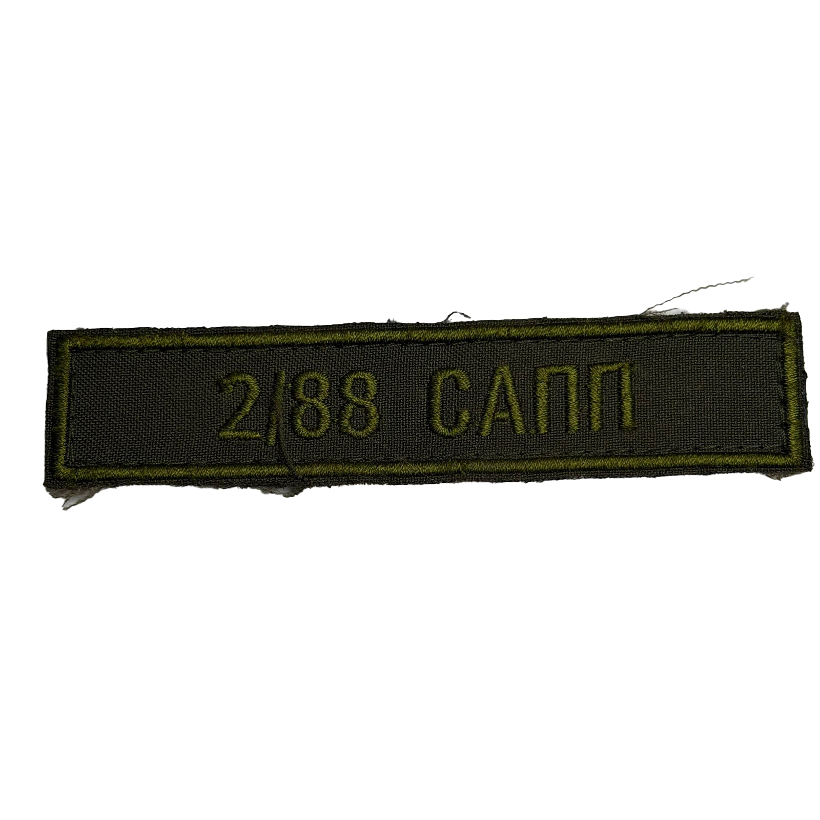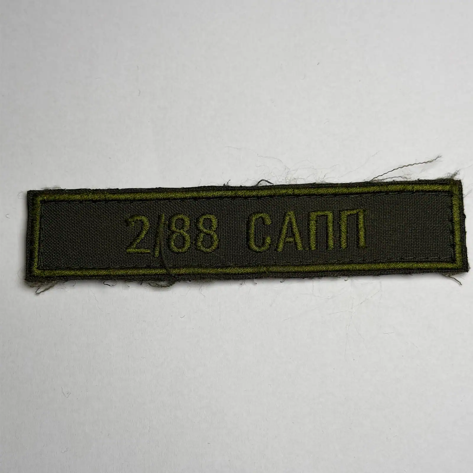 This 88 Sapper Battalion Trophy Chest Patch is a narrow rectangular embroidered insignia produced in subdued field colors for combat uniform wear. The patch displays the marking “2/88 САПП” stitched in low-contrast olive thread on a dark textile base, consistent with engineering troops field equipment standards. Its elongated format indicates chest placement rather than sleeve use.