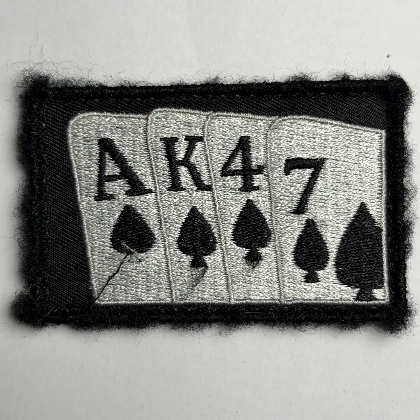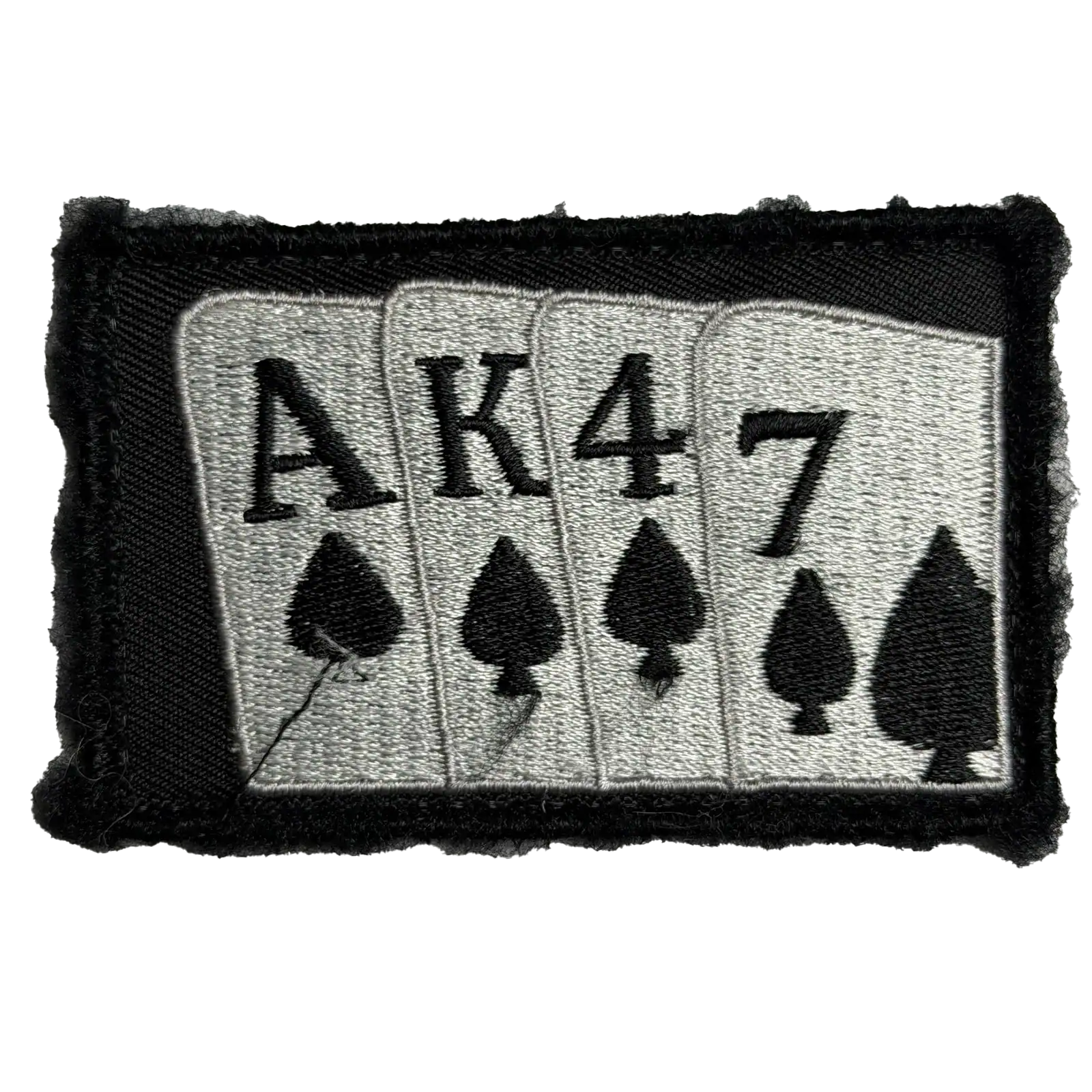 The text AK47 corresponds to the commonly known rifle name and is used here as part of a symbolic composition rather than a technical marking. The spade symbols are decorative and do not indicate rank, unit, or organizational affiliation. No unit identifiers, serials, or standardized insignia elements are present.