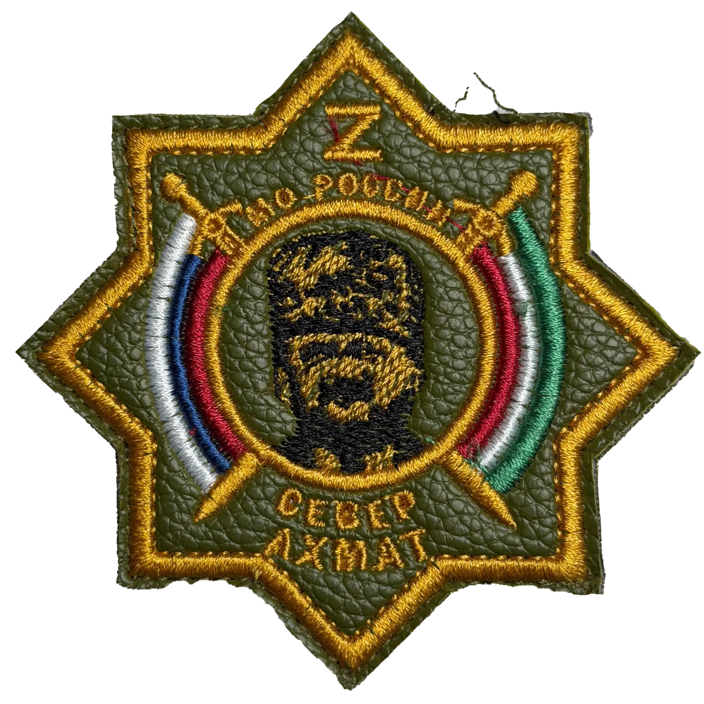 Akhmat Special Forces Chechen Trophy Patch is a non-regulation embroidered textile item produced on a leather base and associated with modern conflict conditions. The patch has a multi-pointed star shape and features a textured green leather background with a thick embroidered golden border outlining the entire form.