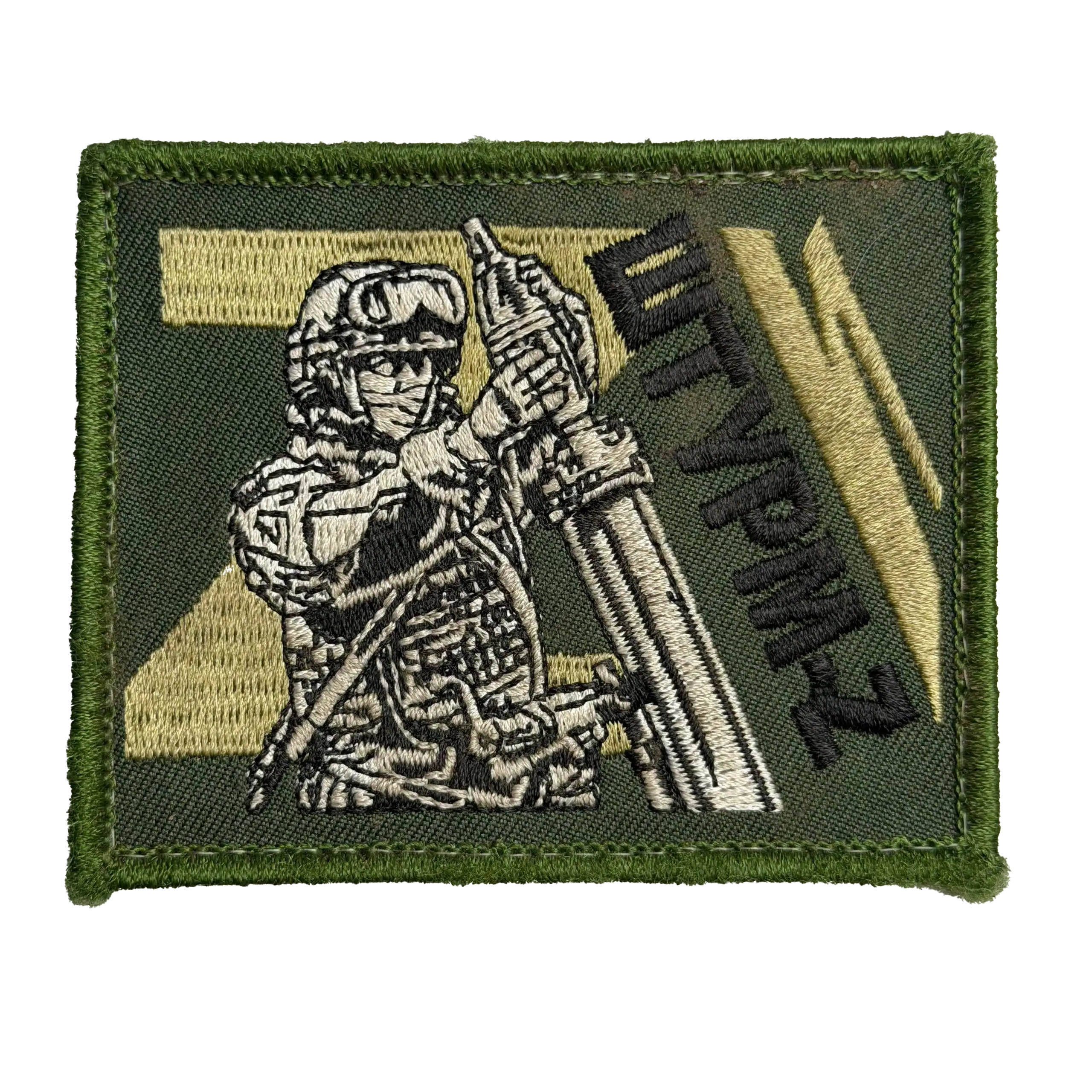 No unit numbers, rank insignia, or official symbols are present. The design is graphic and illustrative, reflecting informal production rather than regulated uniform issue. All visual elements are described exactly as visible on the patch without interpretation beyond appearance.