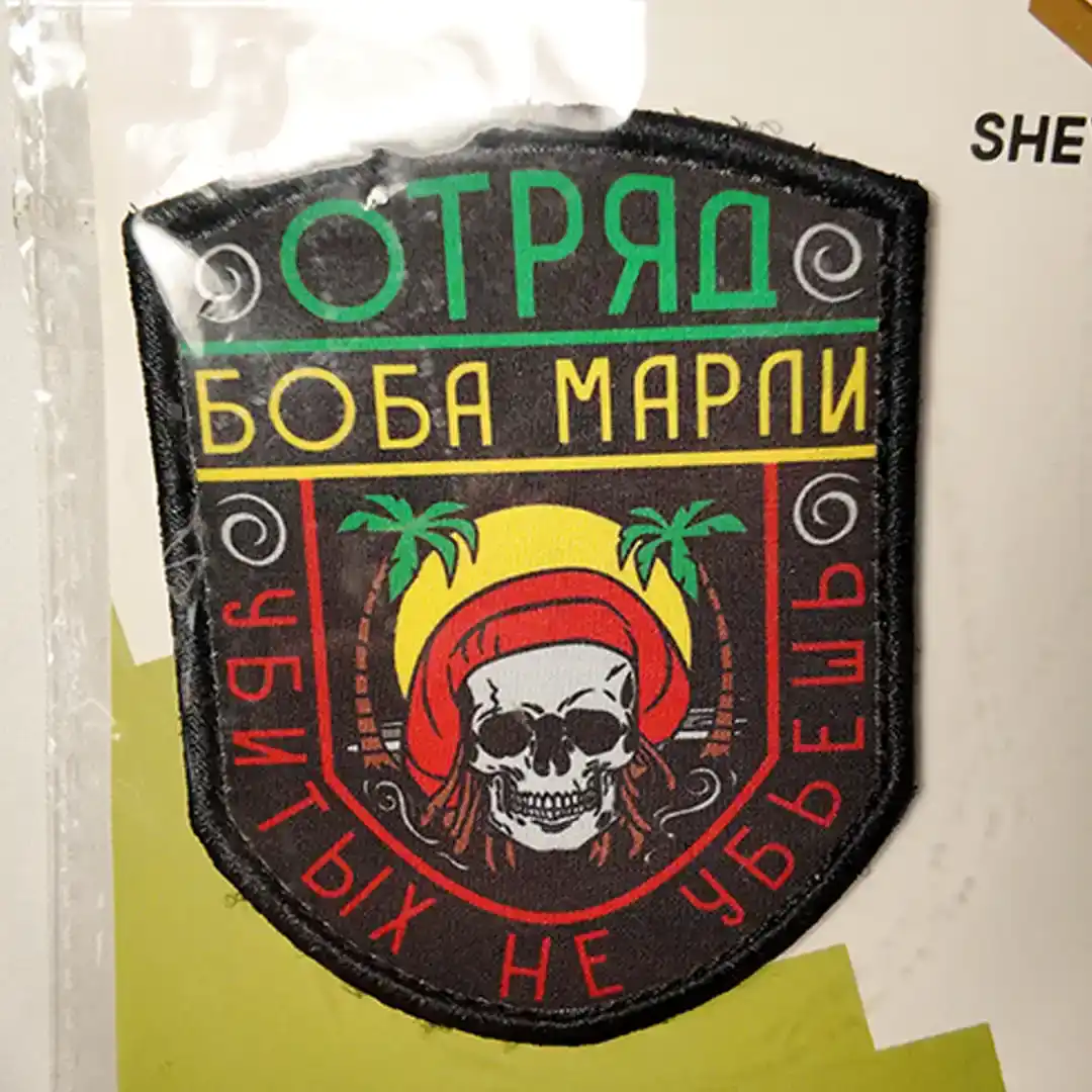 The Bob Marley Squad Patch measures 9×6,5 cm and is a shield-shaped Russian embroidered insignia. The design shows a skull in a red hat with dreadlocks, framed by two palm trees and a yellow circle background. Above the image is the Cyrillic inscription “Отряд Боба Марли,” meaning “Bob Marley Squad,” while below runs the phrase “Убитых не убьёшь,” translated as “You cannot kill the dead.”