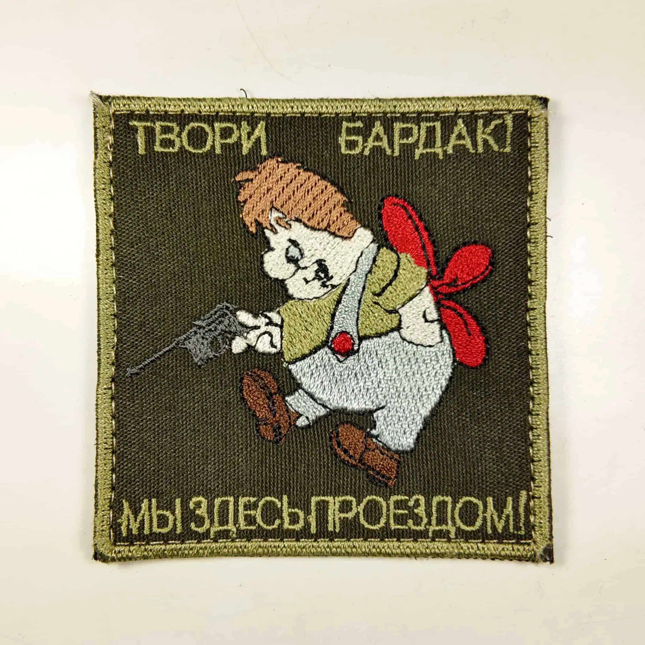 The “Create Chaos – We’re Just Passing Through” patch features a humorous design inspired by Carlson, a popular character from Swedish author Astrid Lindgren’s books. Used by Russian Army and Patriots as a Morale patch during invasion of Ukraine.