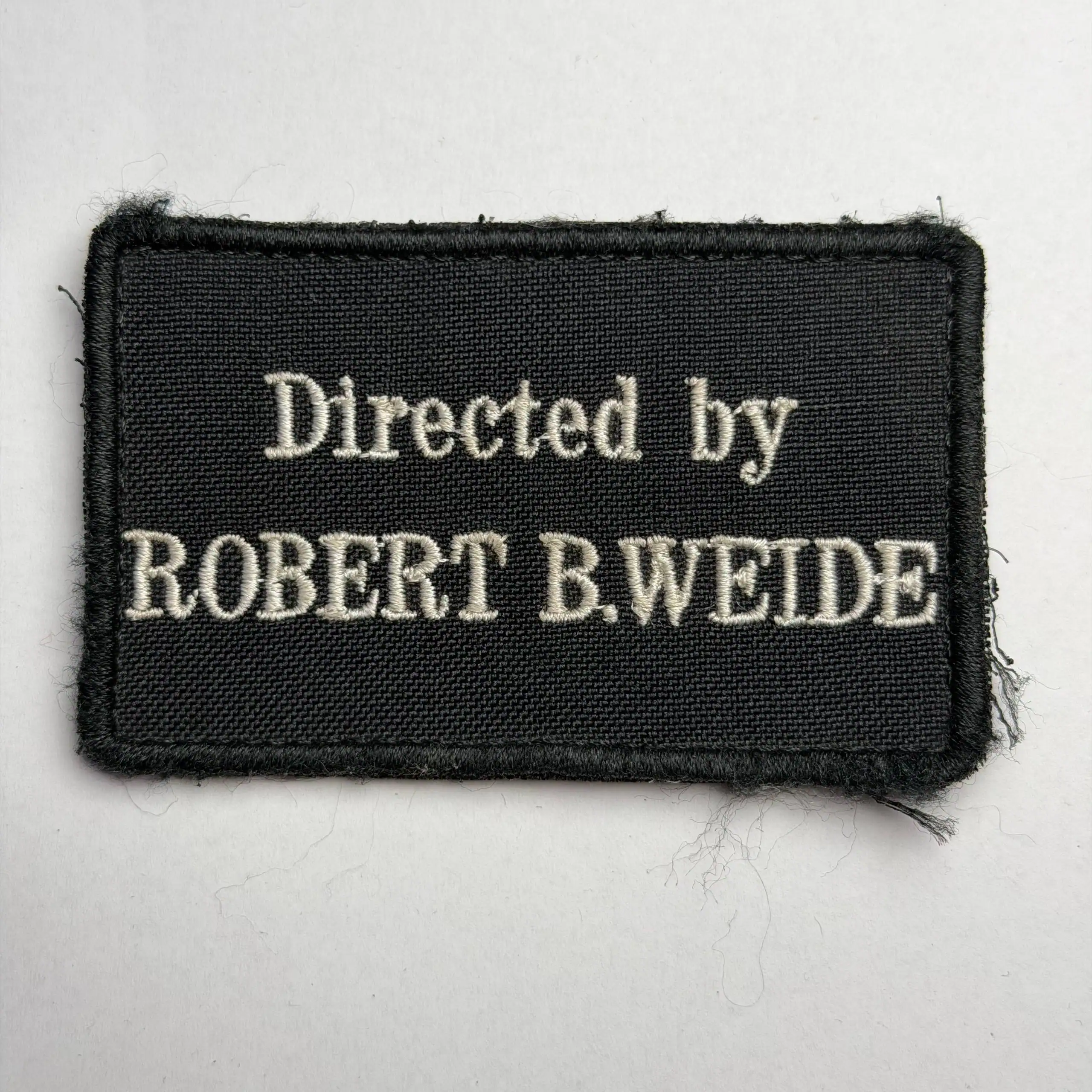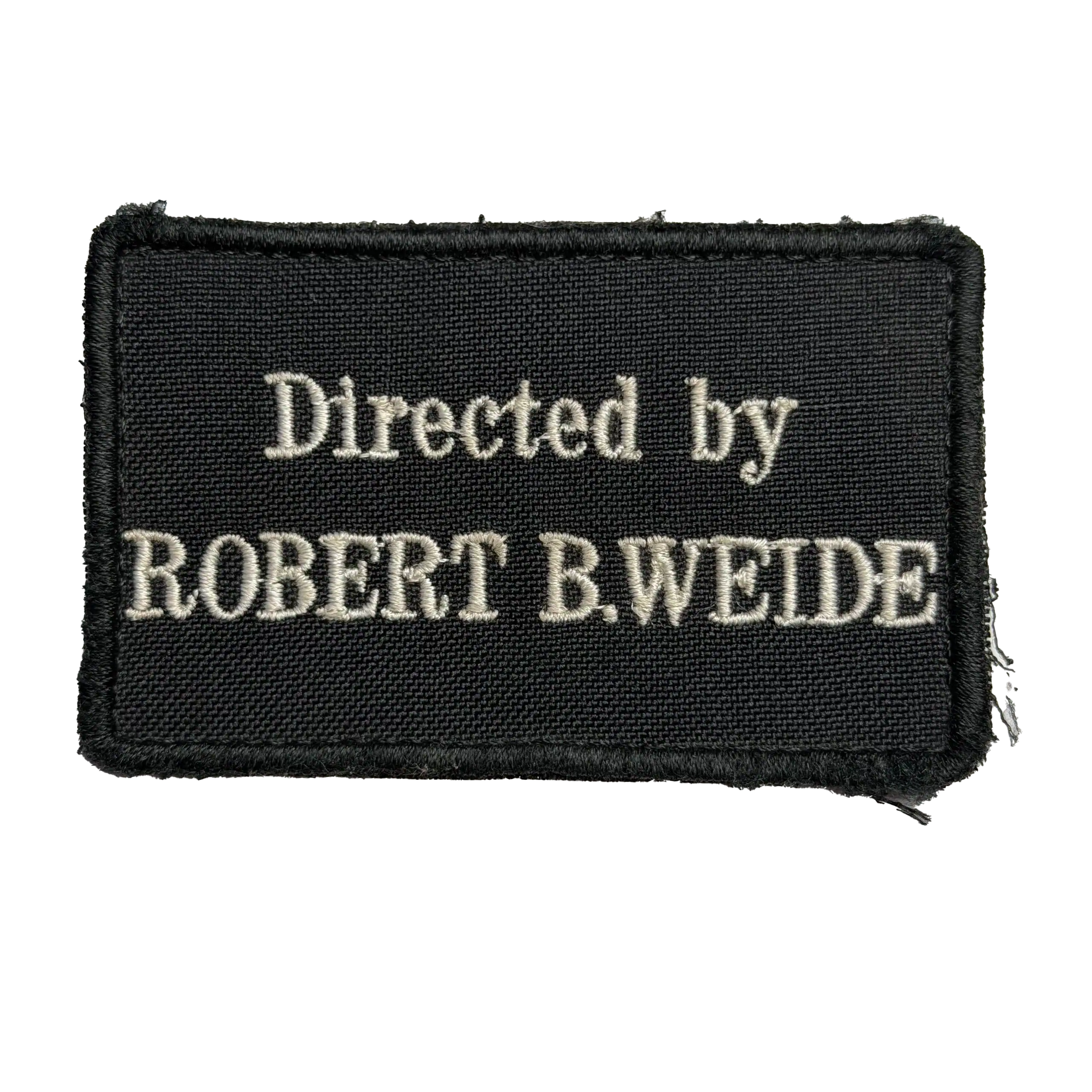 Directed by Robert B. Weide Trophy Patch embroidered on a rectangular black textile base with a stitched border. The patch features two lines of English text reading “Directed by” on the upper line and “ROBERT B. WEIDE” on the lower line, executed in light-colored thread. The layout is centered and text-only, without symbols, graphics, or additional markings.