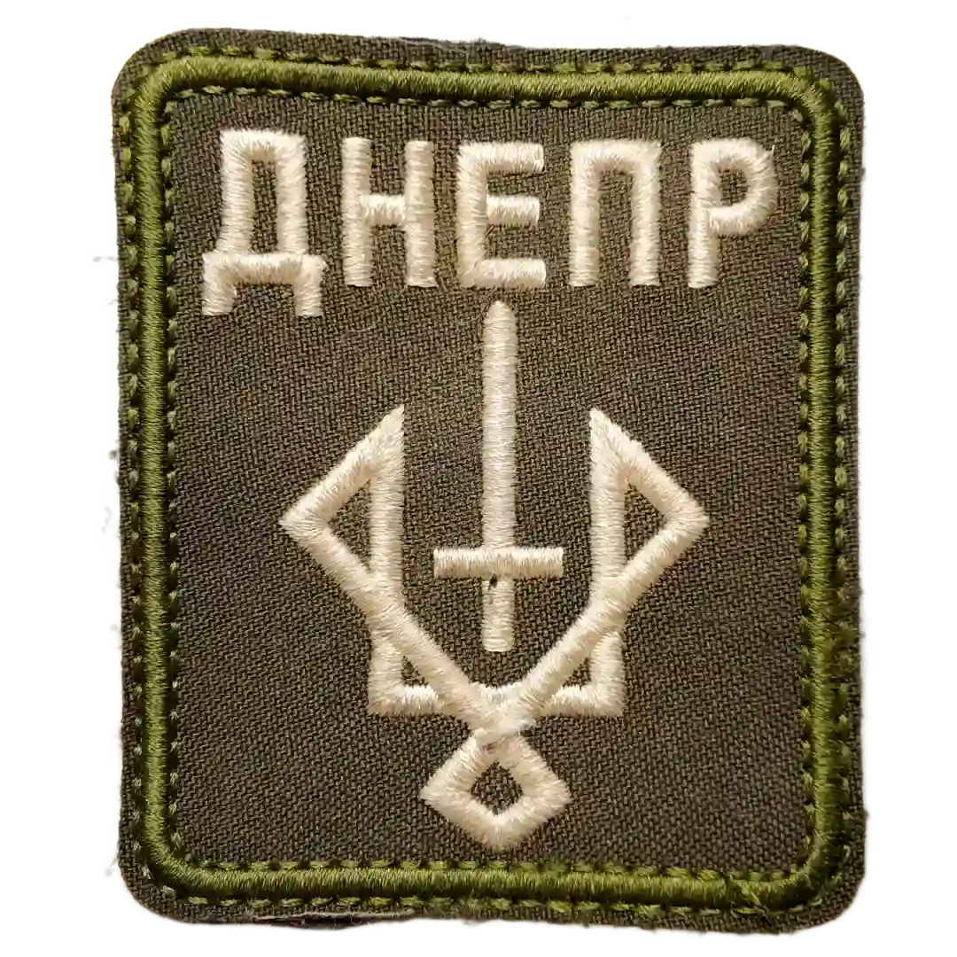 8×6,5 cm size is an authentic battlefield collectible insignia taken from Russian forces. Featuring the embroidered name Днепр with a stylized sword and trident-inspired motif, this design represents the identity of the Dnepr operational grouping.