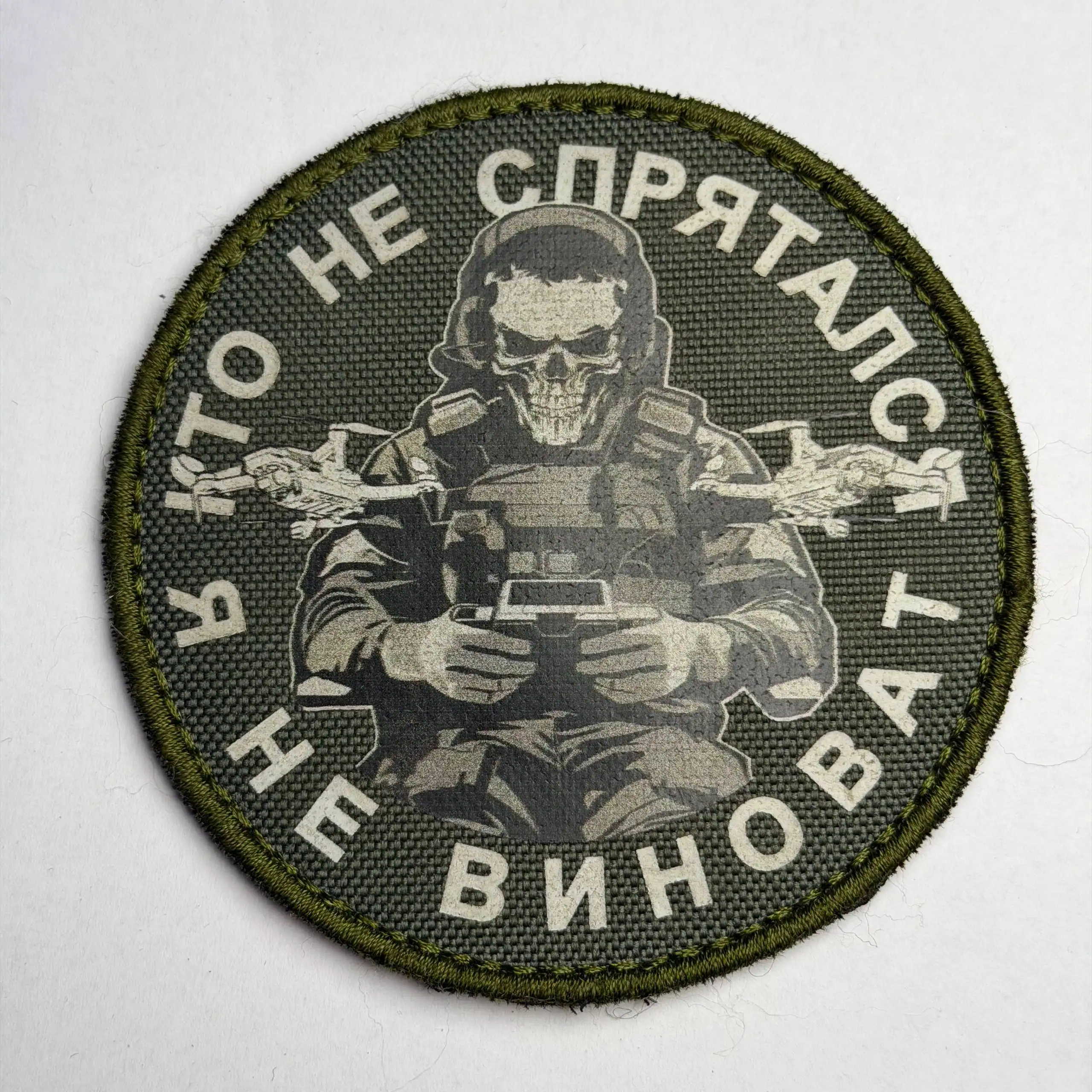 The FPV Drone Operator Russian Trophy Patch is a circular field-made patch depicting a skull-faced soldier equipped with FPV drone control gear, flanked by attack drones in flight. The outer inscription in Russian reads “Кто не спрятался — я не виноват”, which translates to “If you didn’t hide, it’s not my fault” — a phrase commonly associated with FPV drone operators and their lethal battlefield role.