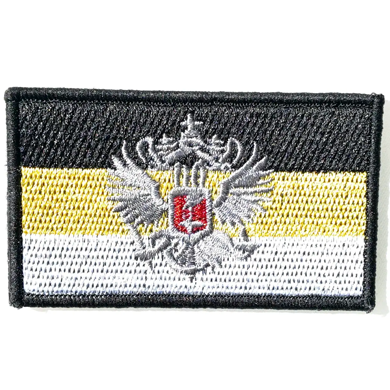 This embroidered patch represents the Imperial Russian flag in the traditional black-gold-white tricolor configuration, topped with the double-headed eagle emblem at the center. Measuring 8.5×5 cm, the patch features a tight-stitched finish with Velcro backing, ideal for field use or display.