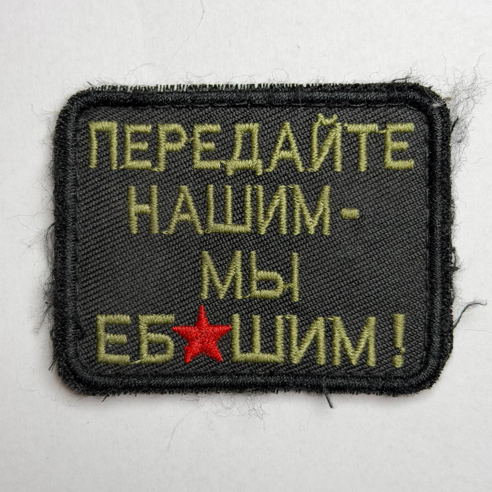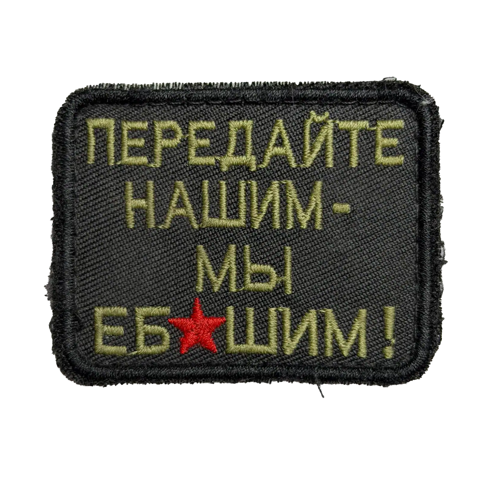 The Cyrillic text reads “ПЕРЕДАЙТЕ НАШИМ МЫ ЕБ*ШИМ.” Translated into English with censorship applied, the phrase means “Pass the word, we are fighting.” The wording is presented as a slogan-based statement and does not reference a unit name, rank, command structure, or formal designation. The red star functions as a graphic accent rather than an organizational symbol.