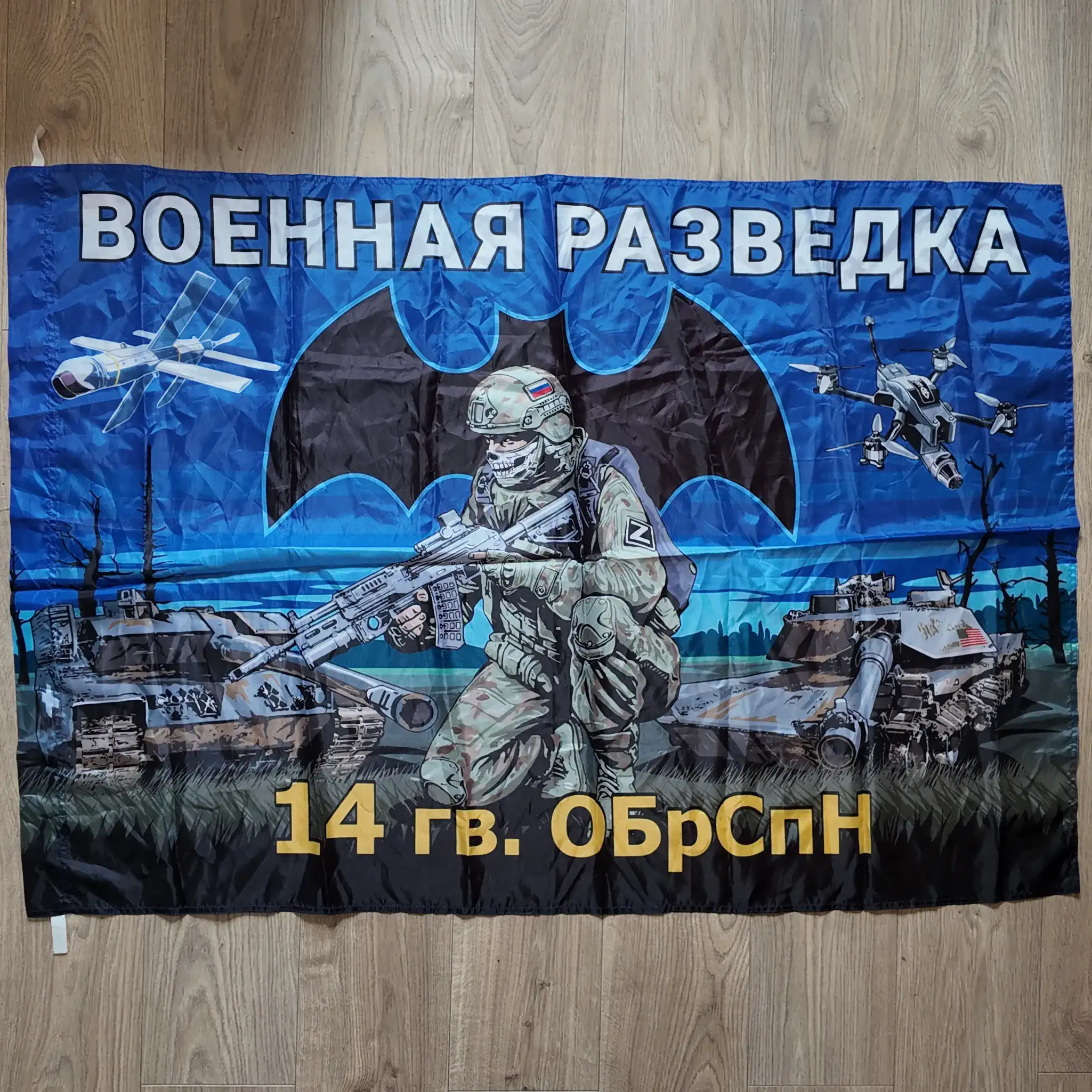 This tactical flag represents one of Russia’s active special forces formations and measures 135×90 cm. Printed in dark tones of blue and black, the flag features a crouched Spetsnaz soldier, drone systems, armored vehicles, and the bat-shaped emblem of military intelligence. The bold inscription “Военная разведка” confirms its role as a Military Intelligence Unit Banner.