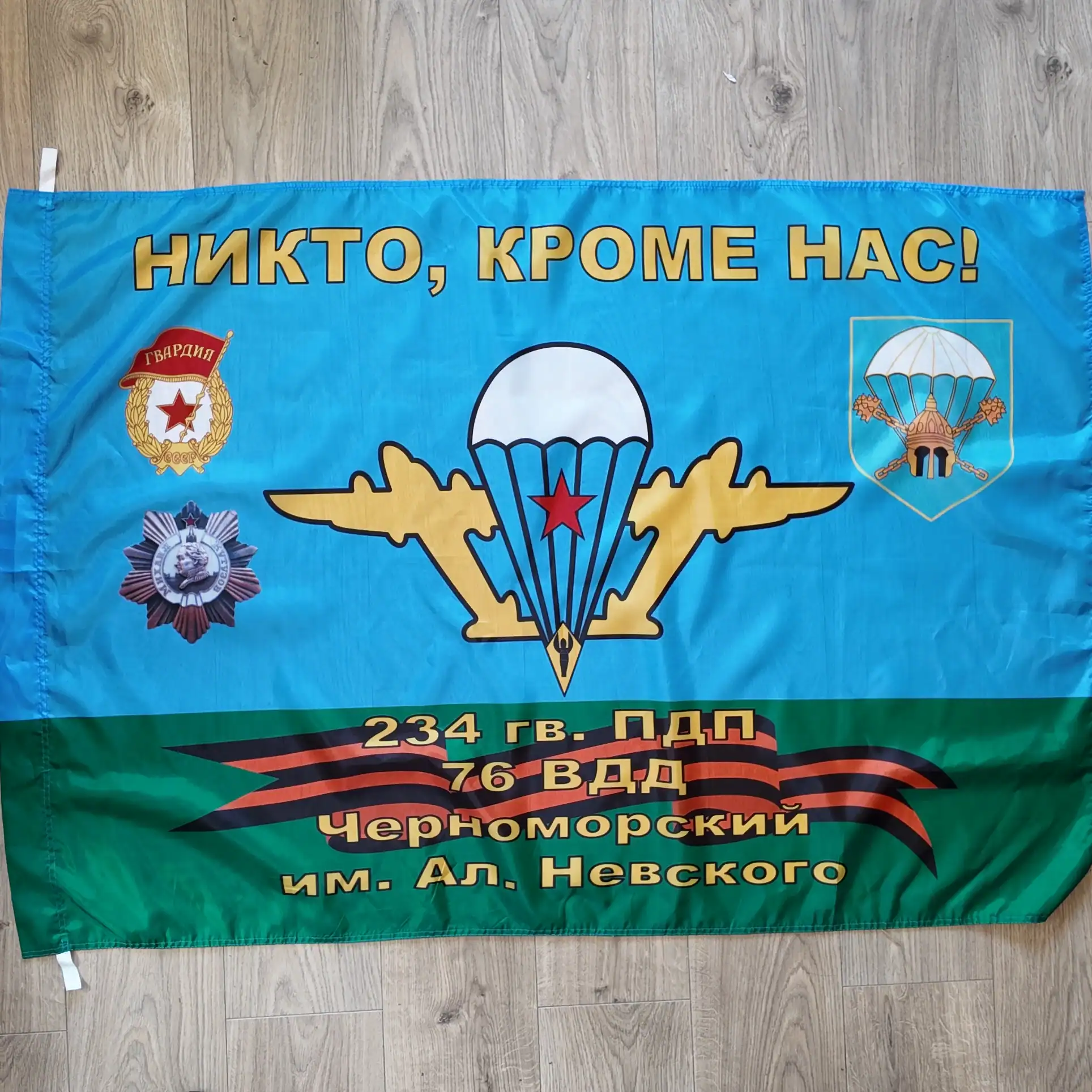 The text “Никто кроме нас” — translated as Nobody but us — highlights the unit’s elite status and serves as the universally known VDV motto. This detail qualifies the flag as a Nobody but us motto flag, rooted deeply in paratrooper tradition.