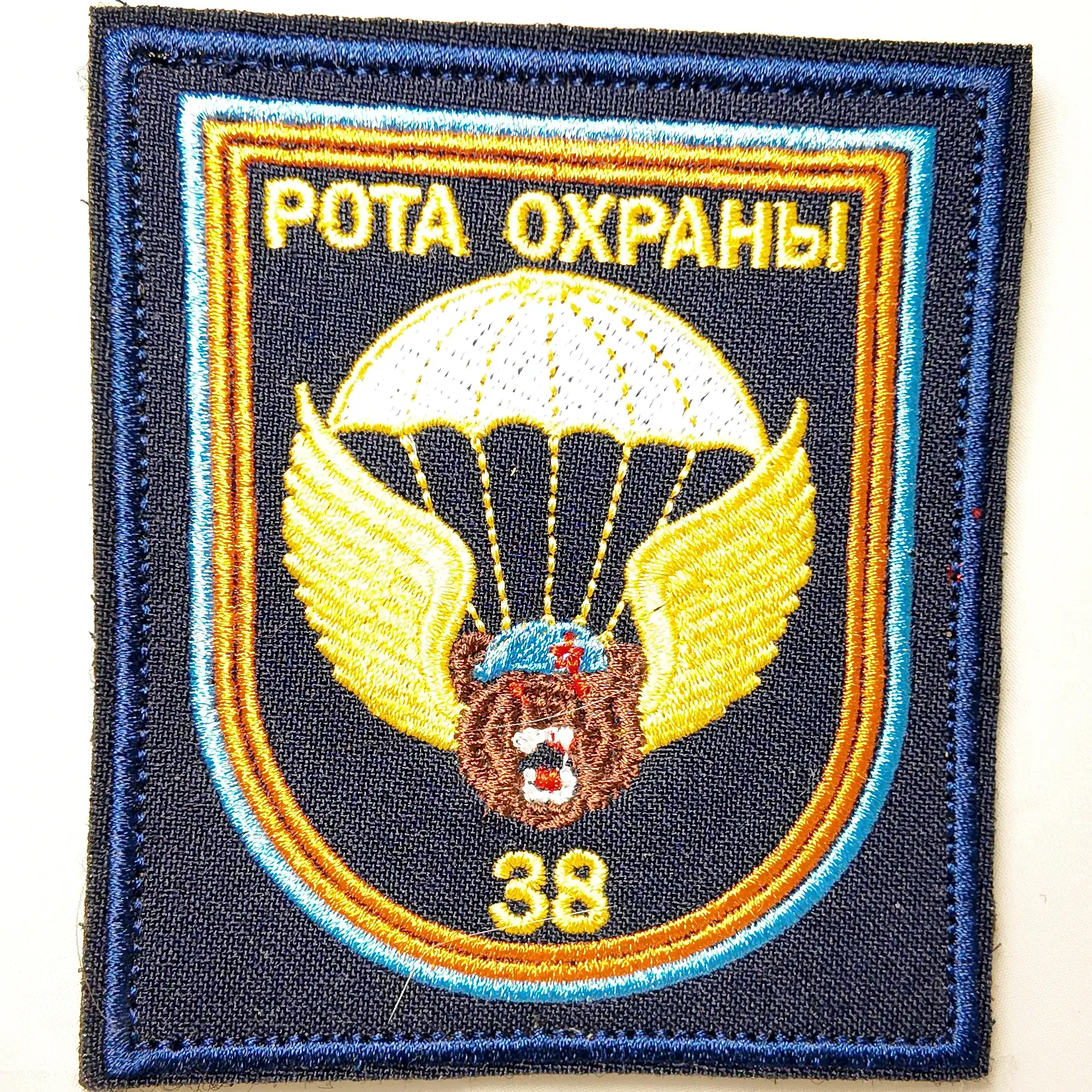 (10×8.5cm) is an embroidered insignia representing the guard company of the 38th Guards Separate Air Assault Brigade (38 гв. ОДШБр). The patch features a bear’s head with a blue beret, golden wings, and a deployed parachute, with “Рота охраны” above and “38” below the emblem. This design is closely associated with VDV airborne units and modern military symbolism.