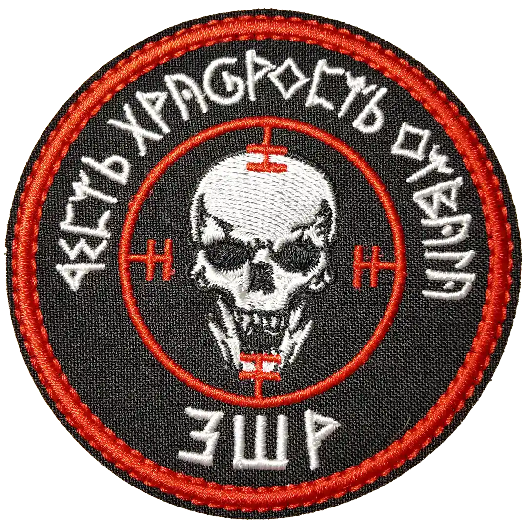 This 8.5cm patch belongs to the Russian 3rd Assault Company. The design features a central skull emblem framed by red lines, with the motto “Честь, Храбрость, Отвага,” translated as “Honor, Courage, Valor.” At the bottom is the abbreviation “ШР,” indicating its assault unit origin.