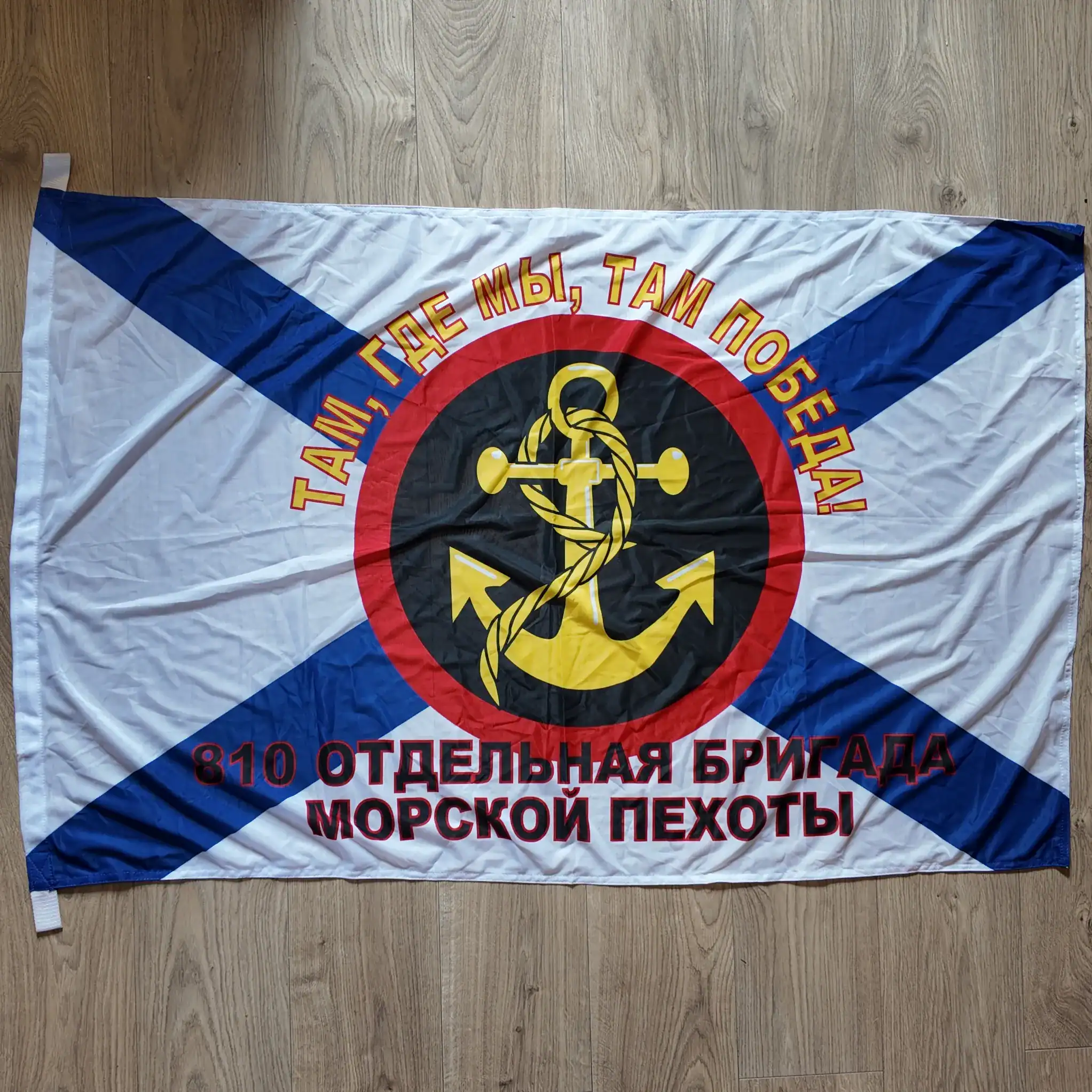 To the right, the unit name “810 отдельная бригада морской пехоты” is written vertically, while the top-left arc carries the recognizable motto: “Там, где мы – там победа!” — translated as where we are there is victory flag. This version is ideal as a marine corps lightweight banner, balancing visibility and airflow in motion.