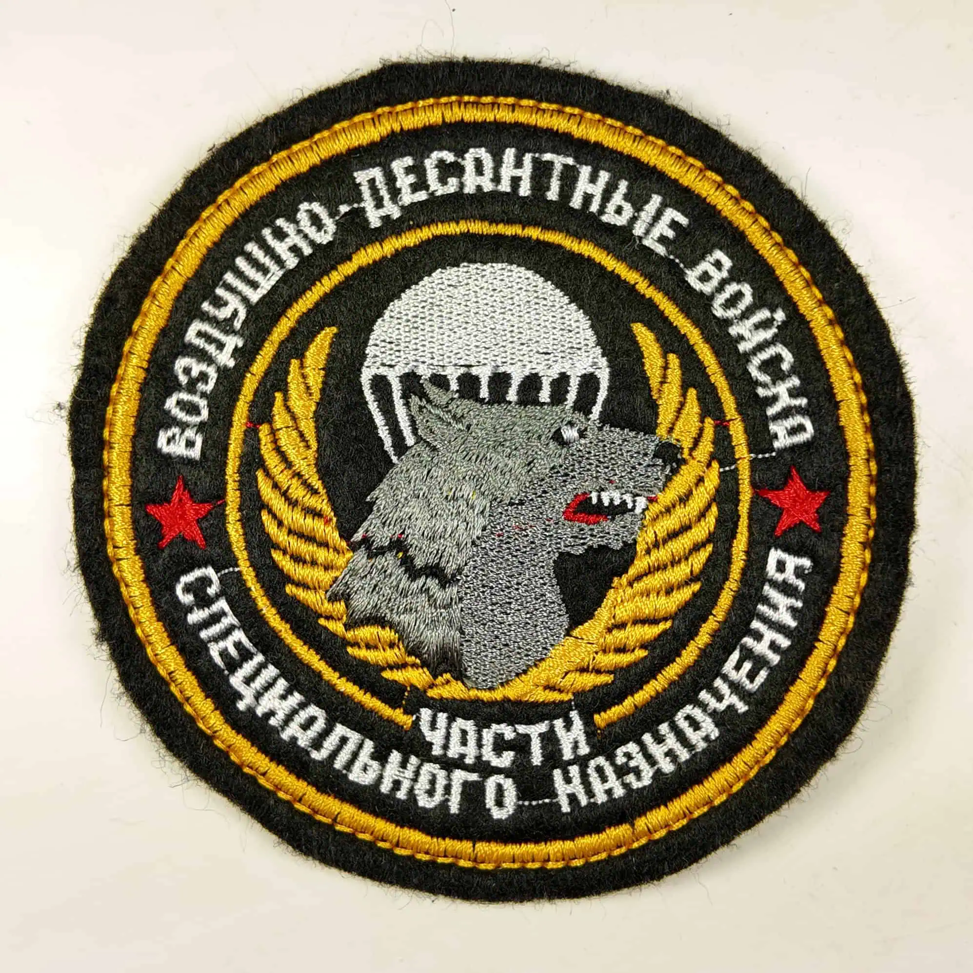 This patch represents the elite units of the Russian Airborne Forces (VDV). It features the image of a wolf, symbolizing courage, independence, and strength — qualities that define the special forces operatives. At the center of the patch is a parachute, emphasizing its affiliation with airborne troops. The golden laurel wreath surrounding the design signifies the honor and valor of the unit, while the two red stars highlight the unit’s prestige and distinguished status. The patch is worn by members of special operations units who are tasked with reconnaissance, sabotage, counter-terrorism, and other high-risk missions.