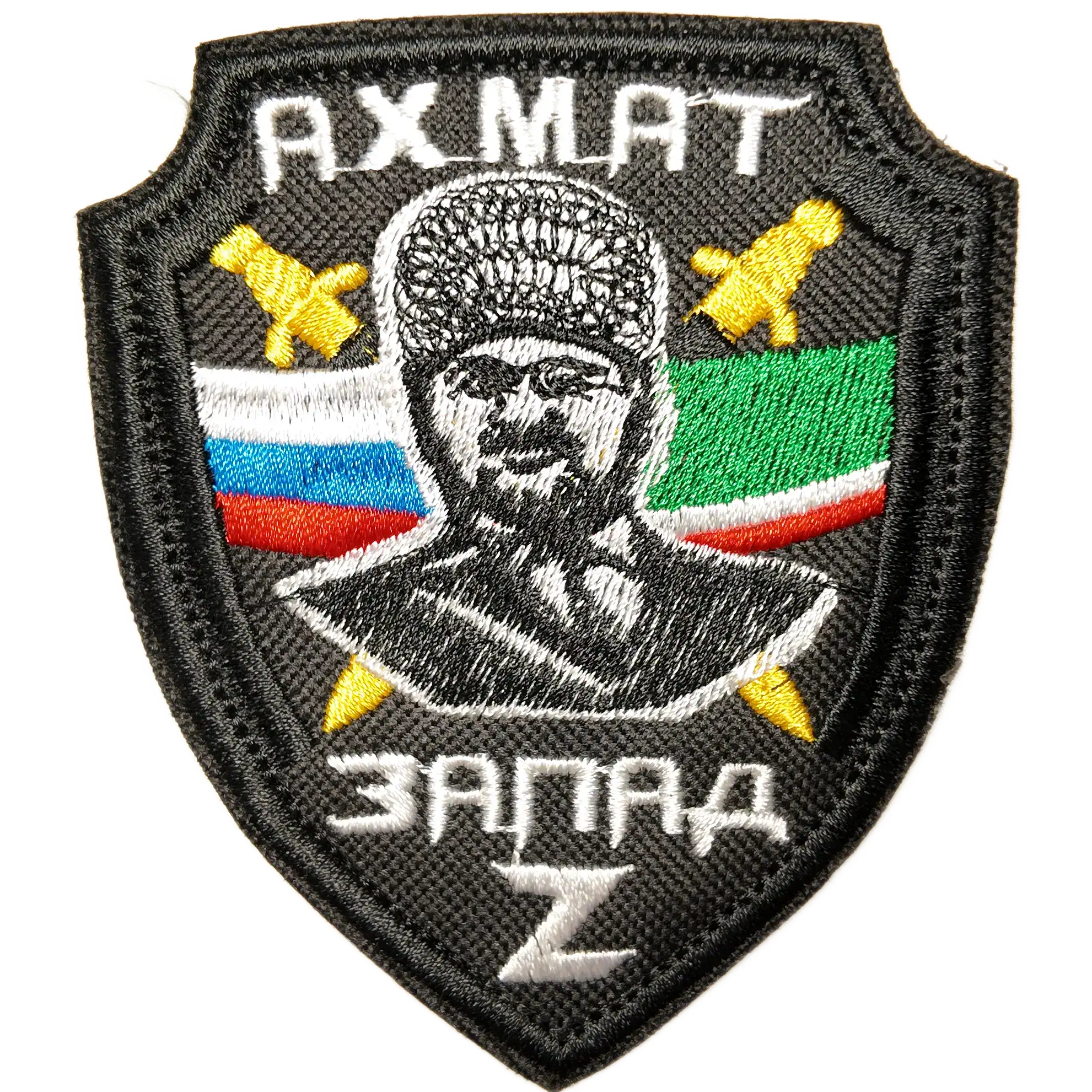 The Russian Akhmat Patch in 9.5×8 cm is an exclusive and rare insignia associated with modern Chechen units within the Russian Armed Forces. The design features a bust with traditional headgear, crossed golden swords, and the Russian and Chechen national colors, accompanied by the letter Z at the bottom.