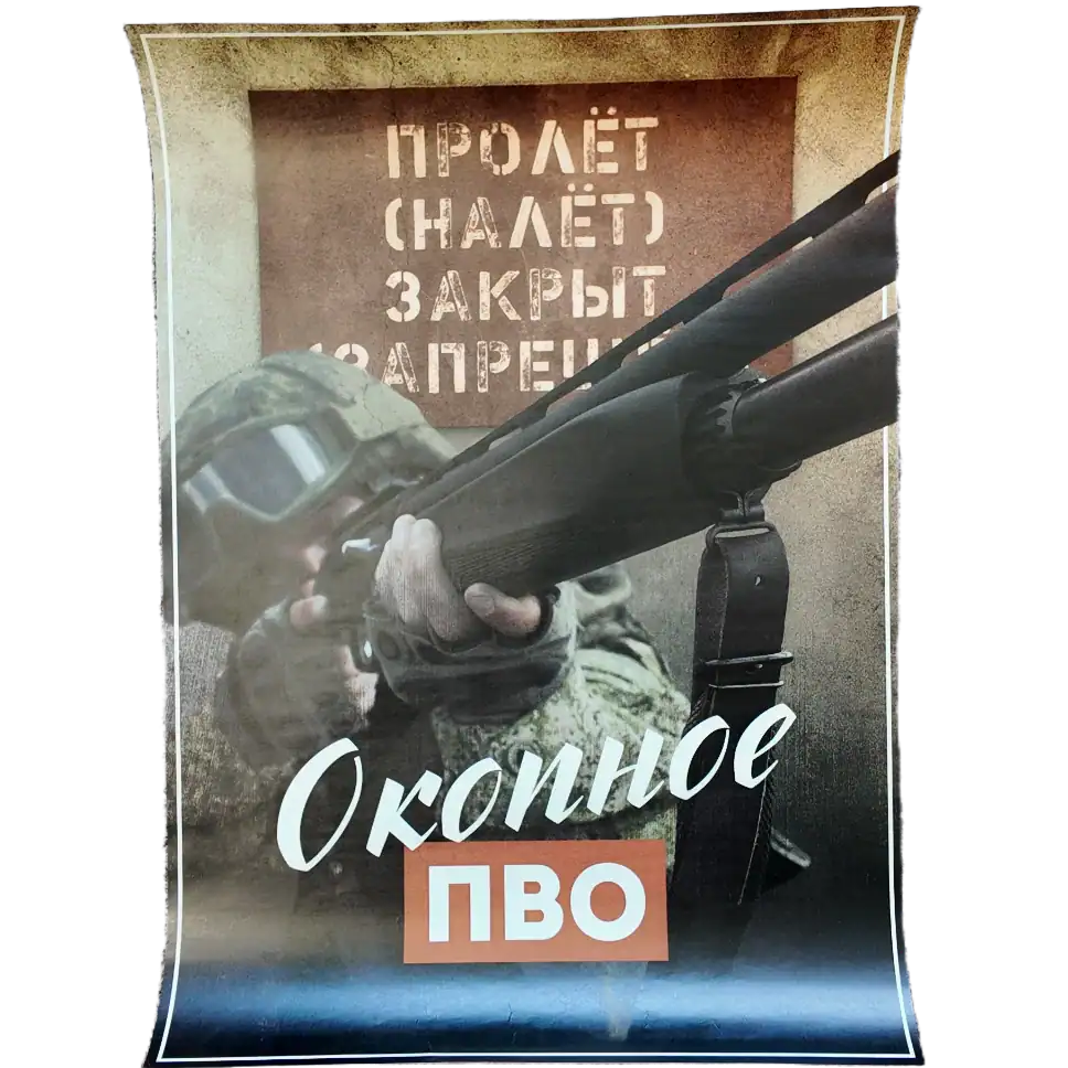 This Russian Anti-Drone Poster captures the growing role of ground-based defenses in modern warfare. Set in a frontline trench, the artwork shows a Russian soldier raising a rifle or machine gun toward incoming UAVs, with the warning: