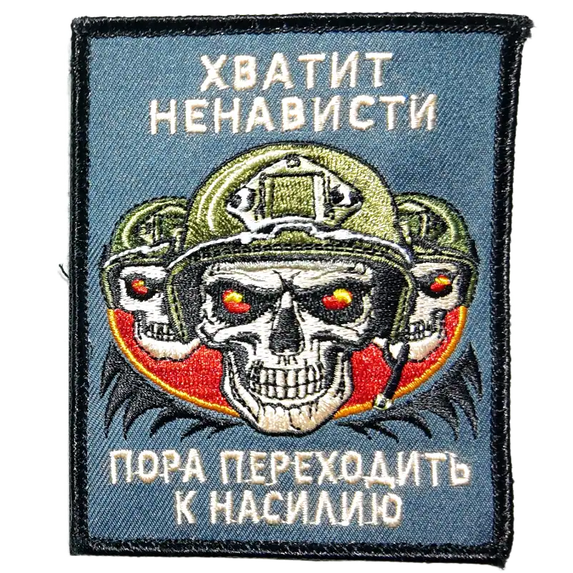 This unofficial Russian Army patch features the inscription “Хватит ненависти – Пора переходить к насилию” (“Enough Hate – Time to Switch to Violence”) and a vivid depiction of three skulls in military helmets, emerging from a fiery background. The visual elements and message convey the militaristic and psychological tone present in some units operating in high-intensity conflict zones.