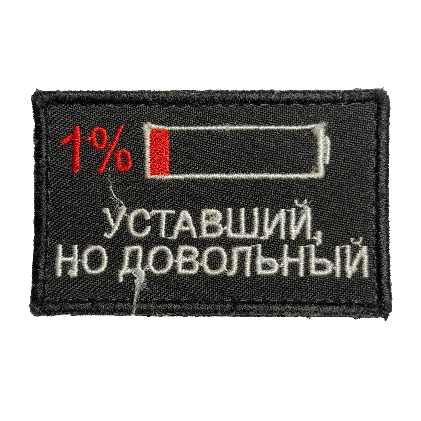 Russian Battery Status Trophy Patch in embroidered textile format. The design features a battery charge indicator with a red low-level segment and the marking “1%” positioned above it. Below the graphic element, the patch displays Cyrillic text reading “УСТАВШИЙ, НО ДОВОЛЬНЫЙ.”