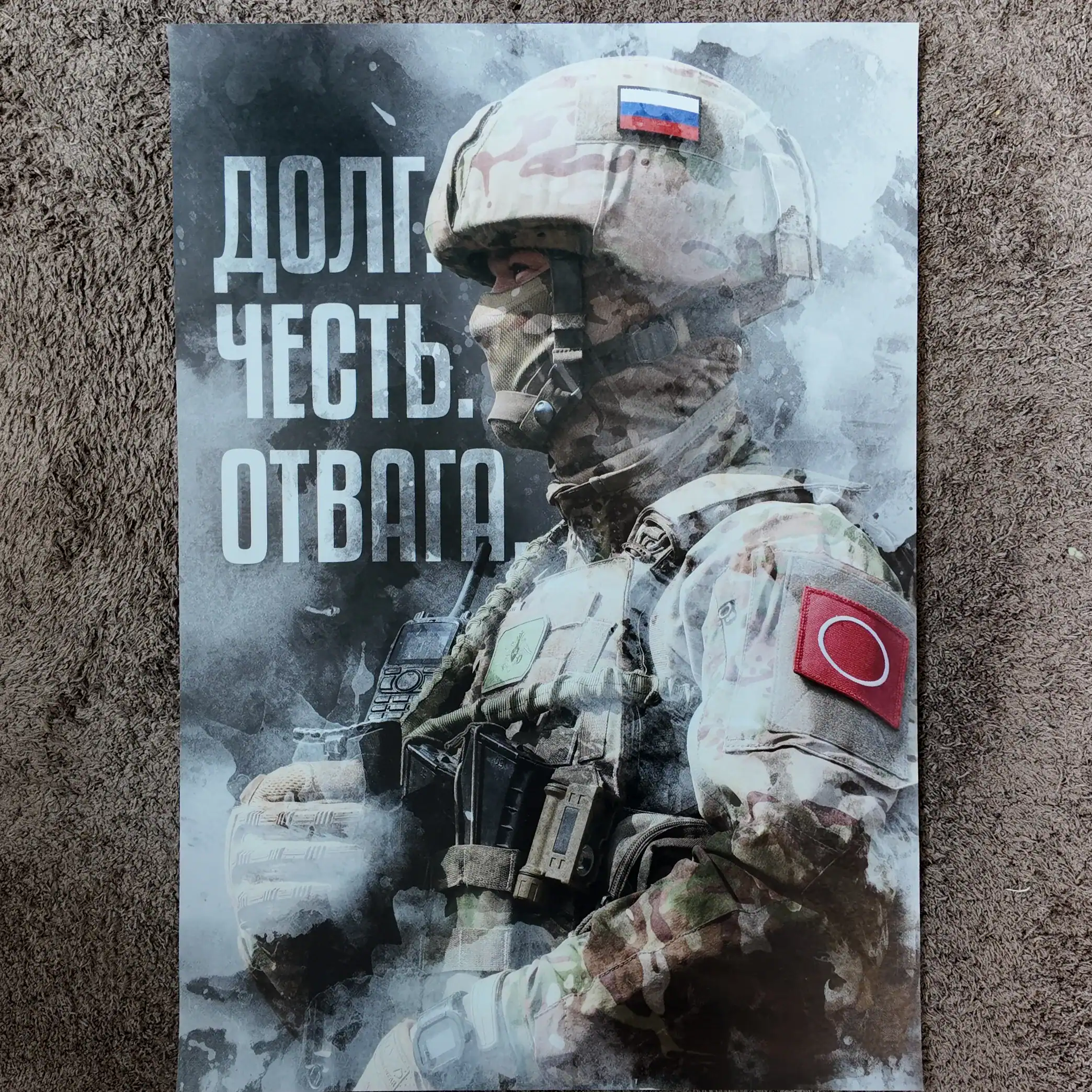 The Russian Duty Honor Courage Poster 60x40cm is a motivational patriotic art example showing a Russian soldier in full combat uniform, with the iconic inscription “Долг. Честь. Отвага.” (Duty. Honor. Courage.) beside him. This work serves as a military tradition print, illustrating the values upheld by Russian service members across generations.
