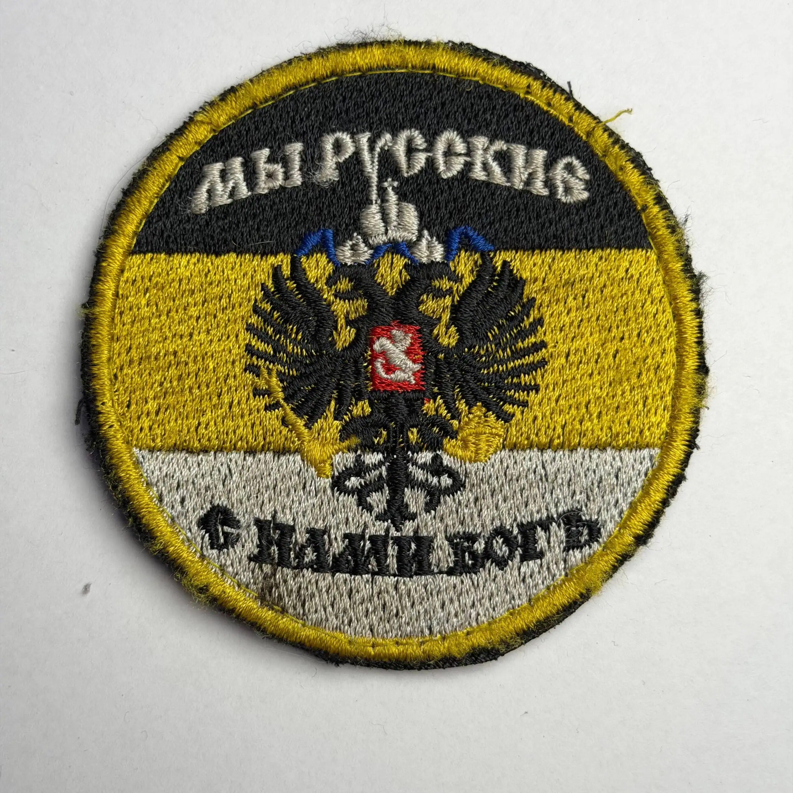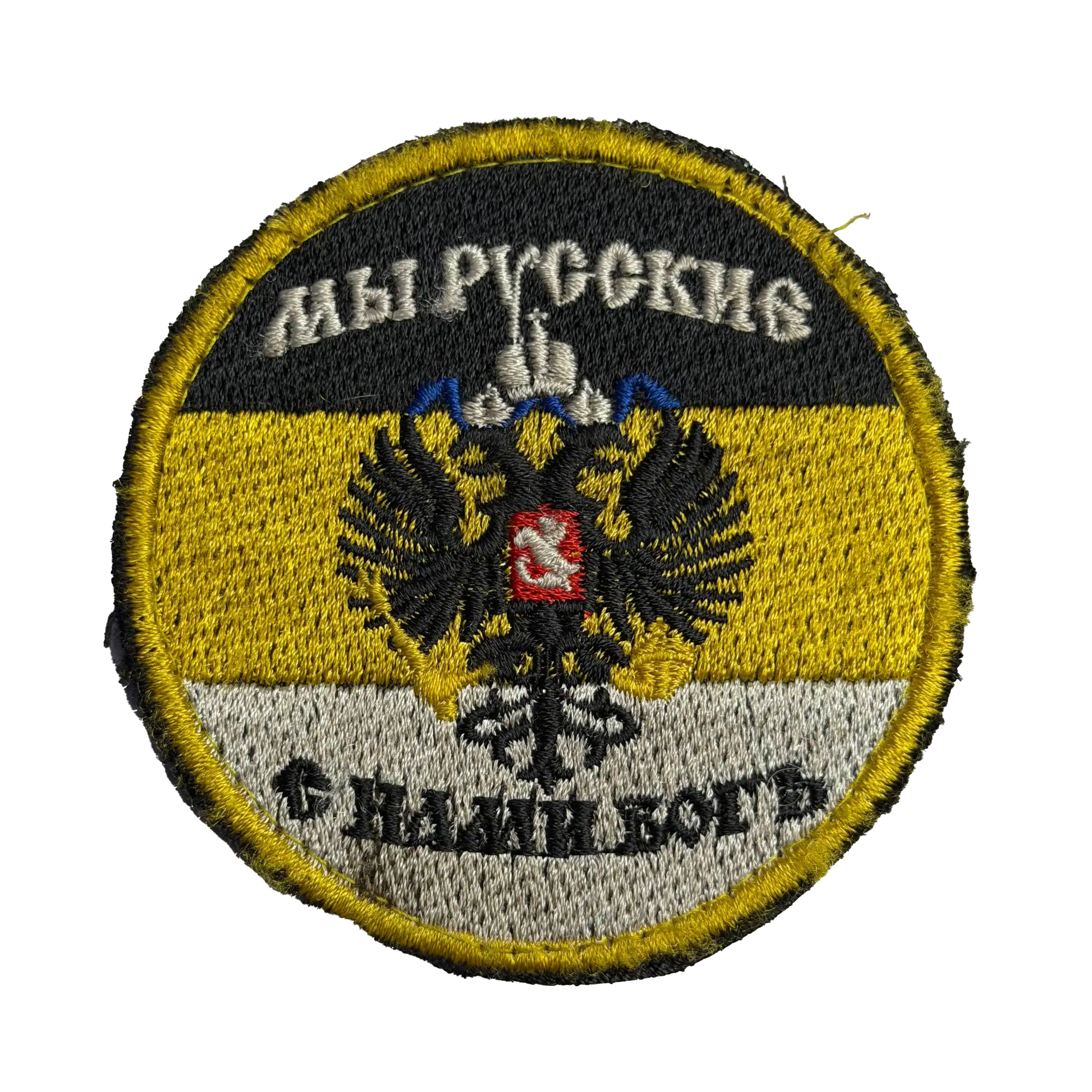 The upper part of the patch contains Cyrillic text reading “Мы русские”. The lower part reads “С нами Бог”. Translated into English, the full slogan means “We are Russians. God is with us.” The text is embroidered in light-colored thread and follows the curvature of the patch.