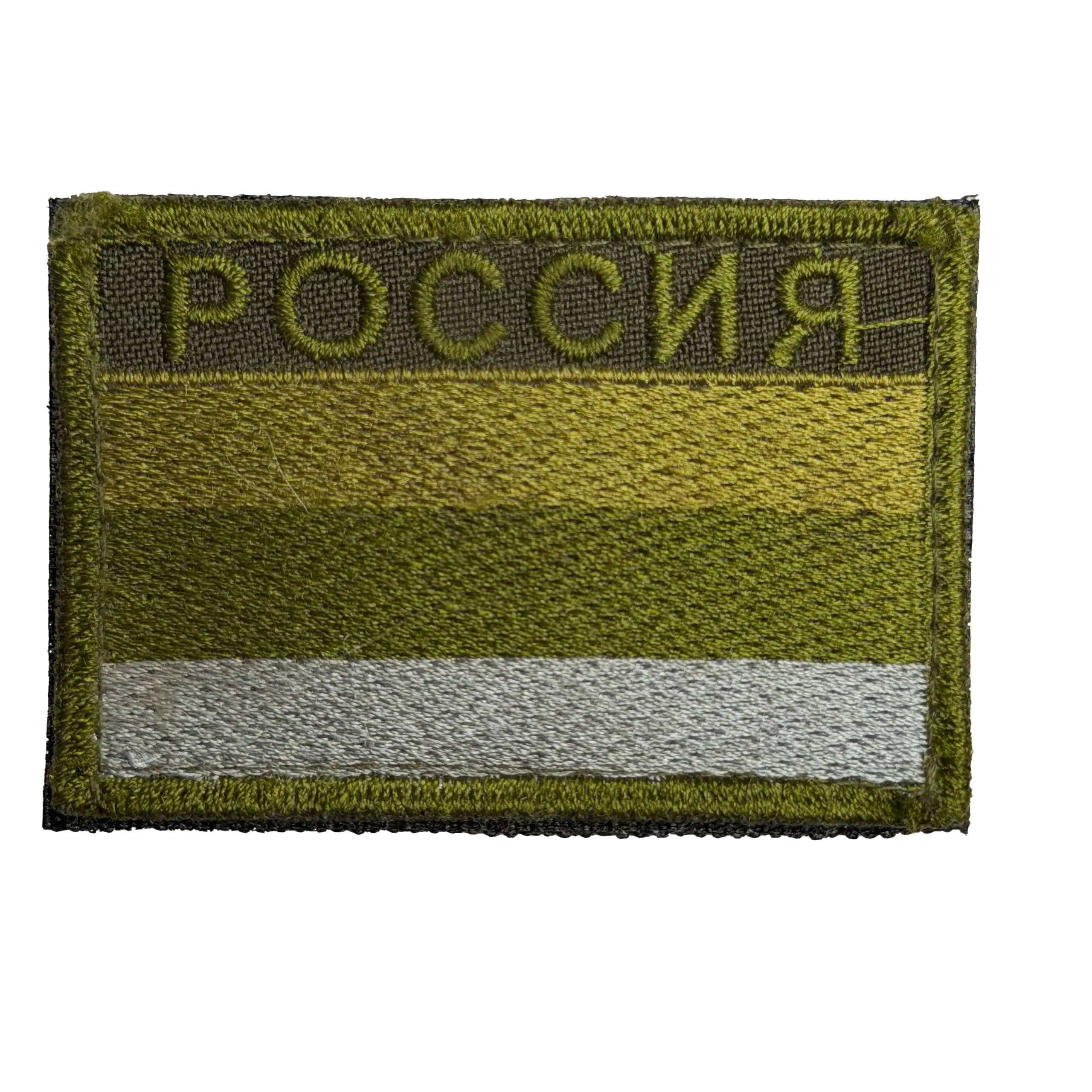 Russian Field RUSSIA Trophy Patch embroidered on a rectangular olive textile base with a stitched border. The design features a horizontal tricolor flag rendered in subdued field tones, with the word “RUSSIA” embroidered above the flag. The embroidery shows minor thread irregularities and edge wear consistent with field-used trophy gear textiles.