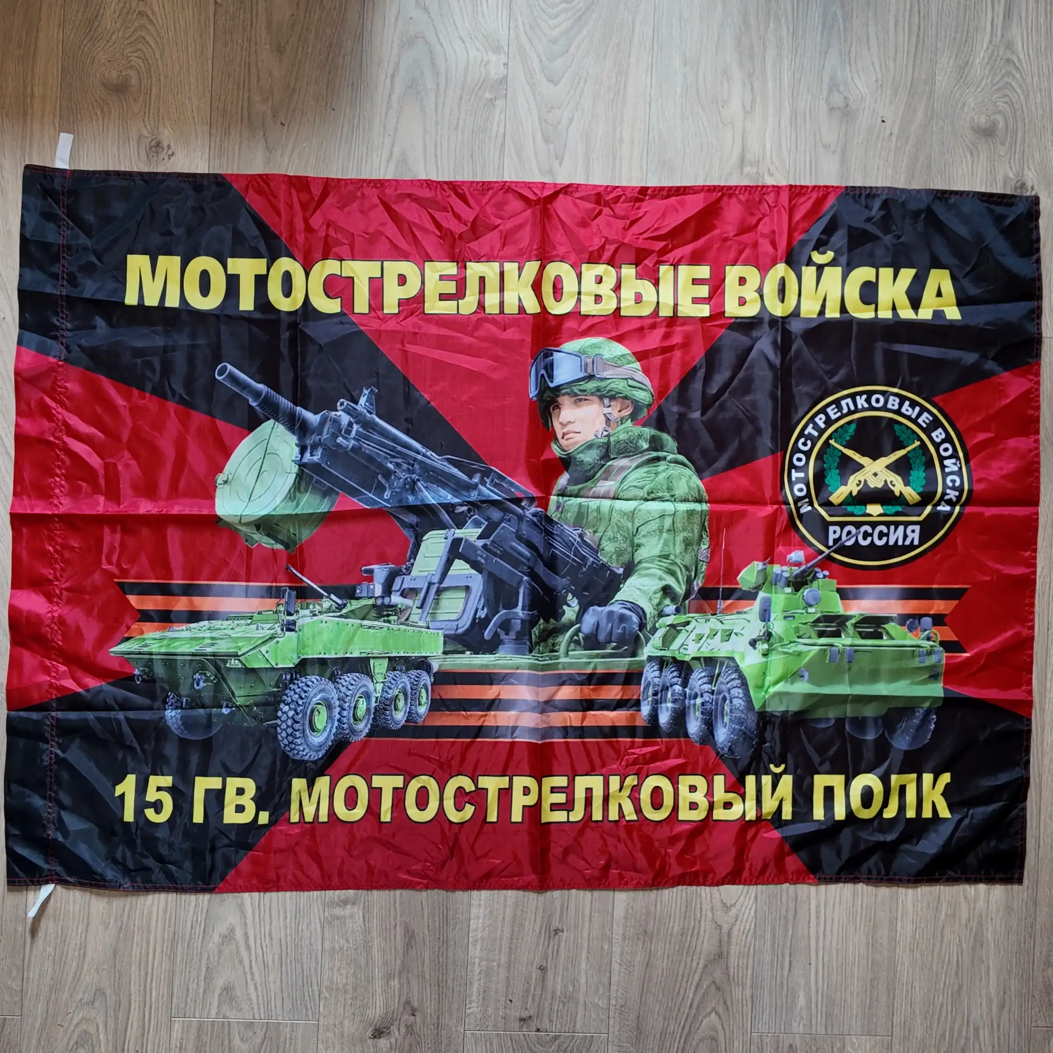 This eye-catching Russian military flag belongs to the 15th Guards Motor Rifle Regiment and is produced in the standard 135×90 cm format. It features bold red and black rays, an armed infantry soldier, armored vehicles, and unit identification in bright yellow Cyrillic letters. The emblem of the Motor Rifle Troops of Russia is prominently displayed in the center.