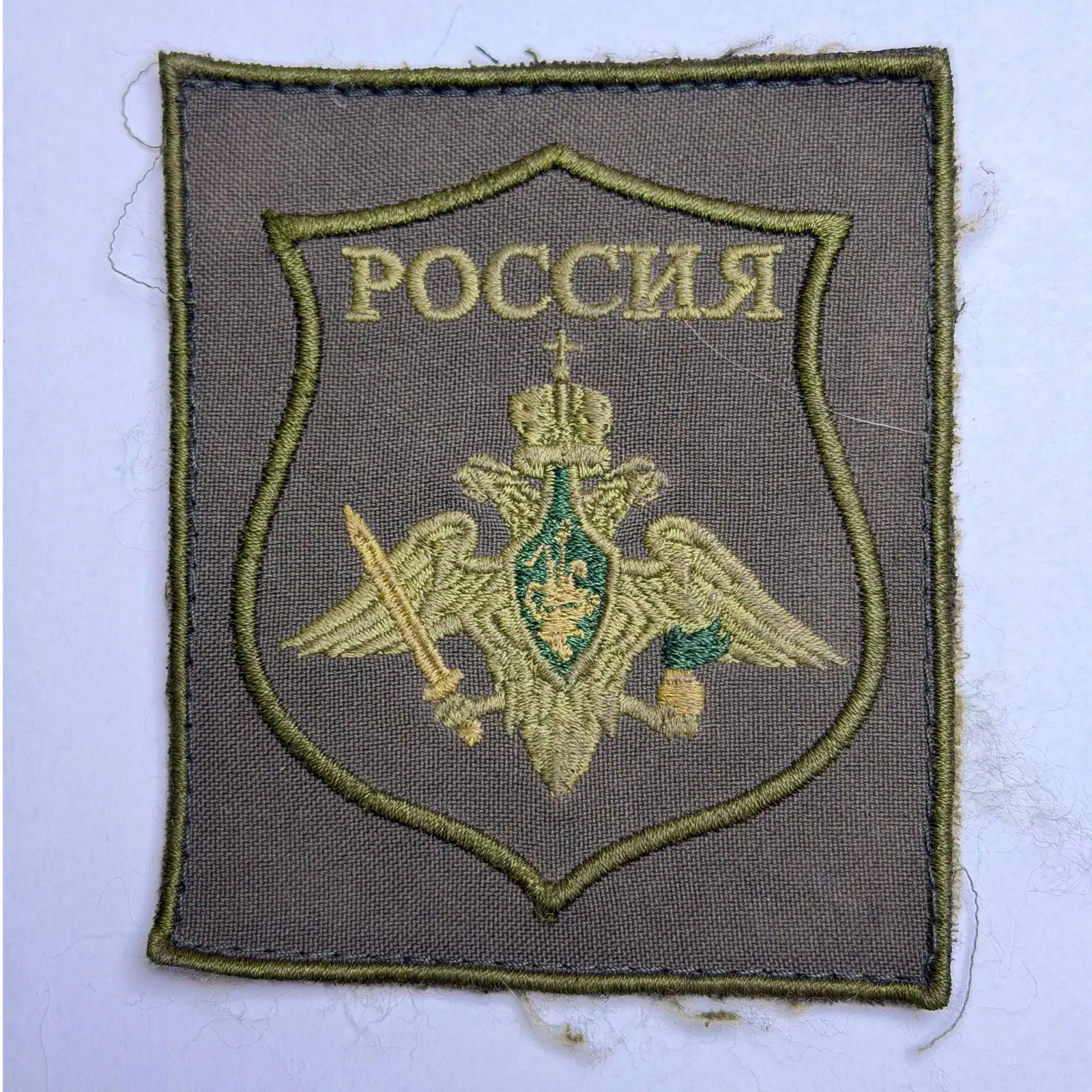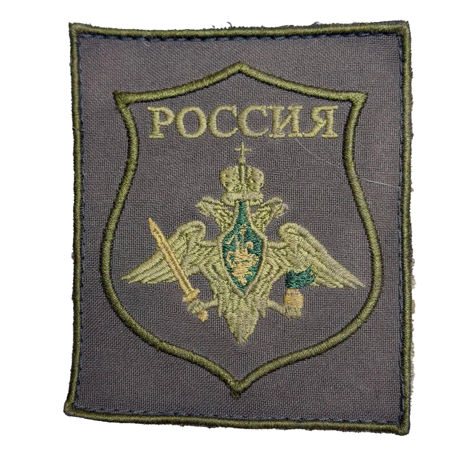 The Cyrillic text “РОССИЯ” is embroidered at the top and translates into English as “Russia.” The inscription serves as a national identifier and does not include unit numbers, ranks, or sub-unit designations. The emblem corresponds to ground forces symbolism presented in a field-color execution.