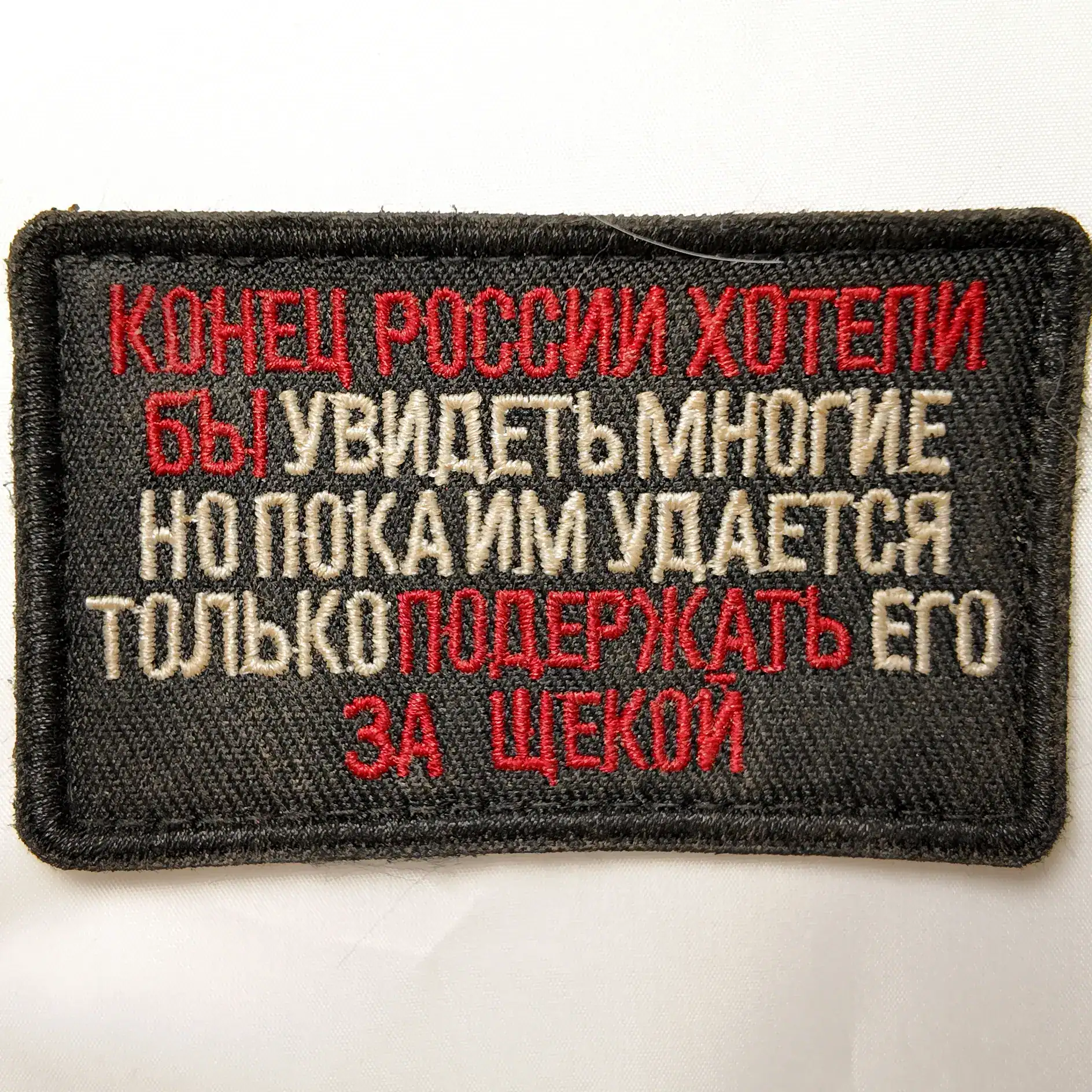 This humorous line reflects the type of unofficial morale patches often carried by Russian soldiers. It qualifies as an authentic joking trophy patch, combining satire and combat culture.