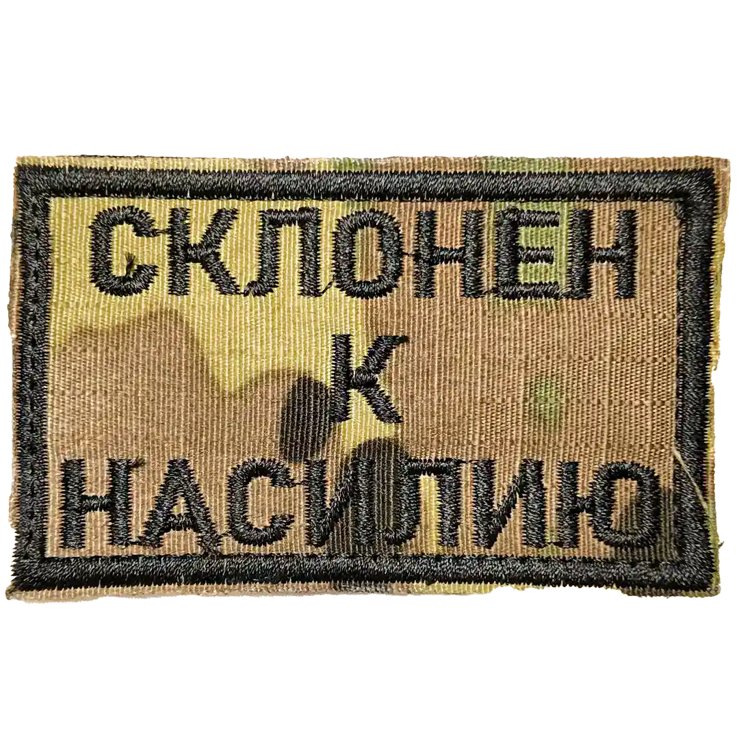 The Russian Meme Morale Patch 8x5cm is a rectangular camouflage badge with the embroidered phrase “СКЛОНЕН К НАСИЛИЮ” (Inclined to Violence). Designed in black text over a camo field, this patch is a typical example of Russian morale insignia used by soldiers and volunteers during the war in Ukraine.