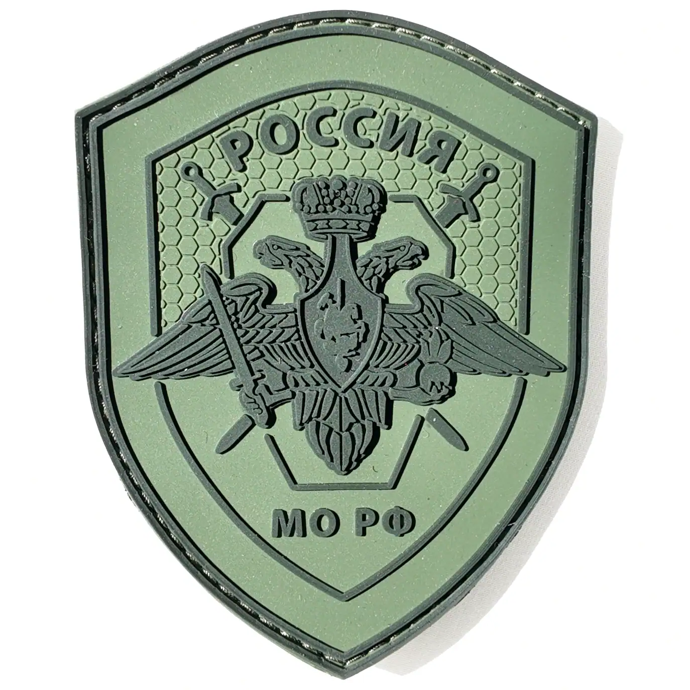 This 9×7 cm PVC patch features the official emblem of the Ministry of Defense of the Russian Federation (MO RF). Rendered in subdued military green tones, the patch displays the double-headed eagle with sword and scepter — the standardized symbol worn by personnel across various branches of the Russian Armed Forces.