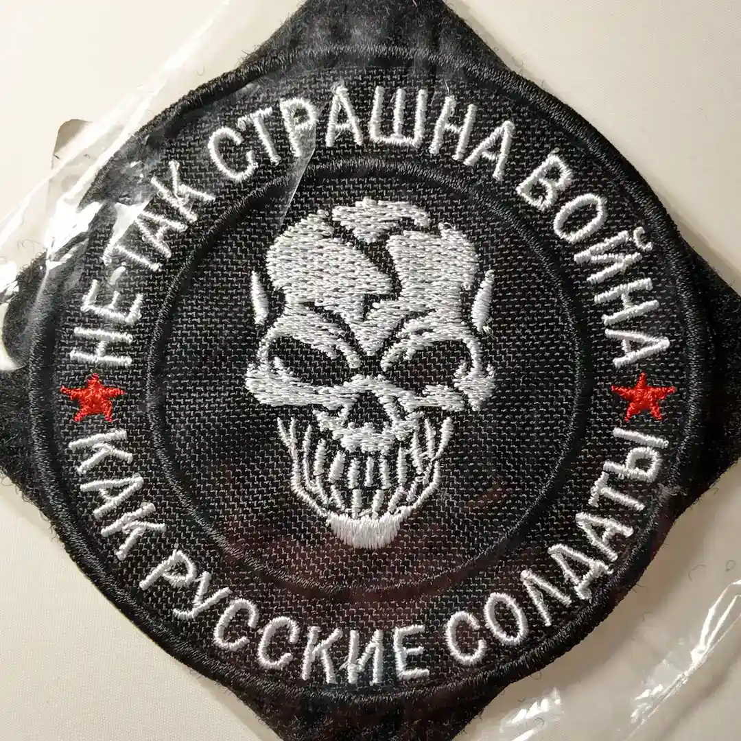 This 8cm Russian morale patch carries the inscription “Не так страшна война, как русские солдаты,” translated as “Not as Terrible as Russian Soldiers.” The design features a menacing white skull in the center, flanked by two red stars, embroidered on a black fabric base with reinforced border stitching.