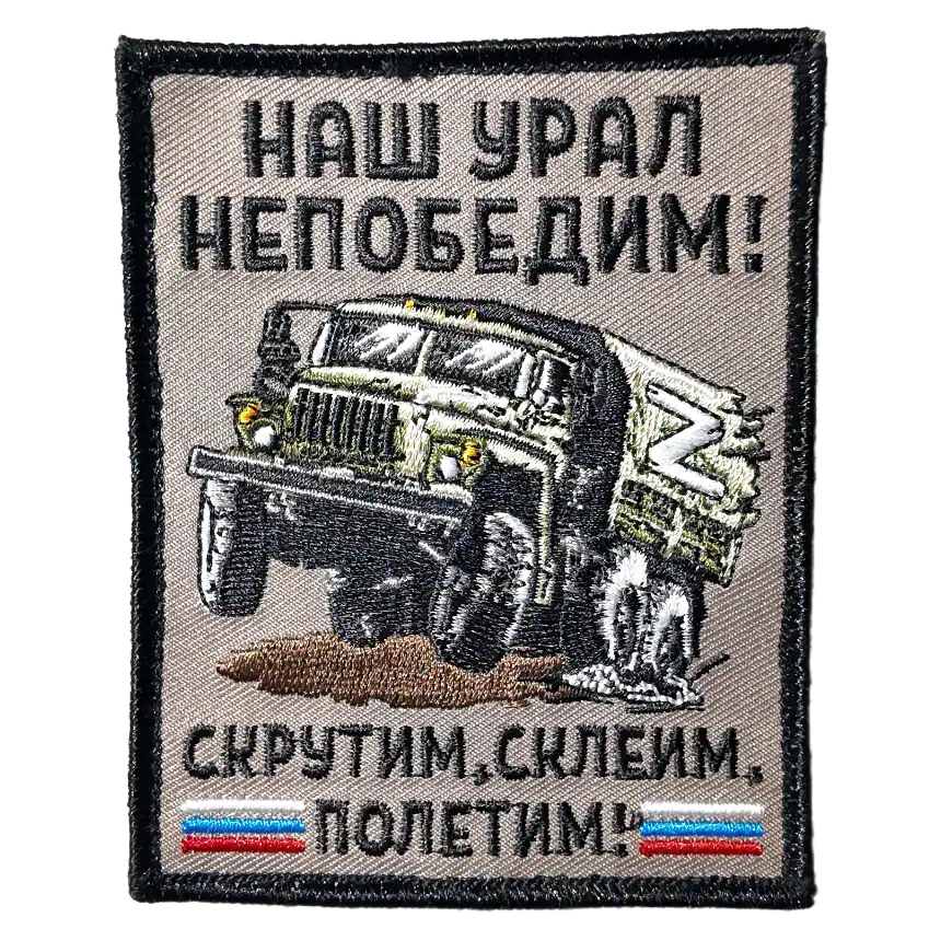 Velcro-backed morale patch featuring the slogan “Наш Урал непобедим — Скрутим, склеим, полетим!” (translated as “Our Ural is invincible — We’ll roll, glue, and fly!”). This patch measures 8×8 cm.​​