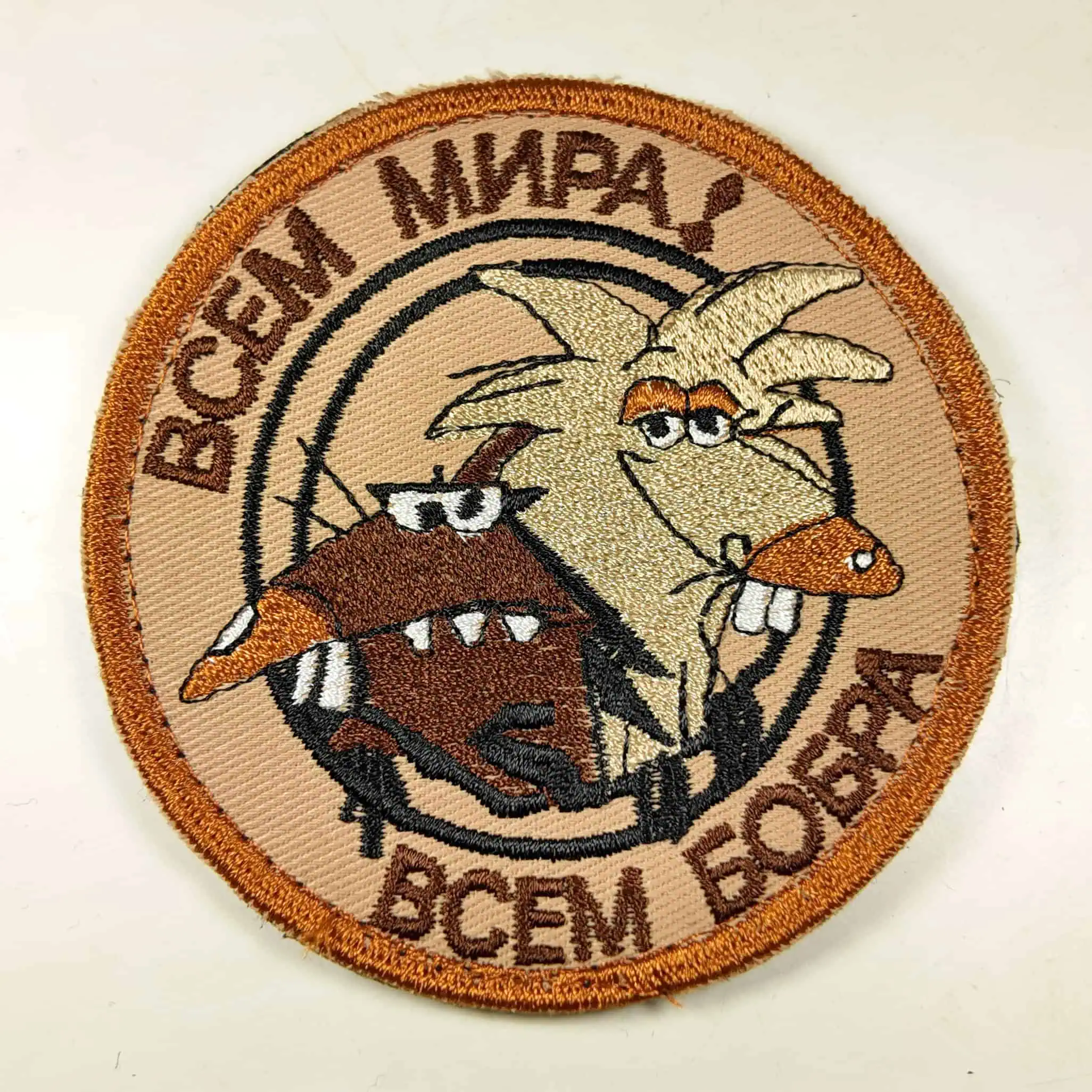 This unique patch showcases a playful design with two animated beavers and the humorous slogan “Всем мира, всем бобра” (Peace to All, Beavers to All). The patch uses a warm beige and brown color palette, making it stand out on tactical uniforms or casual gear.