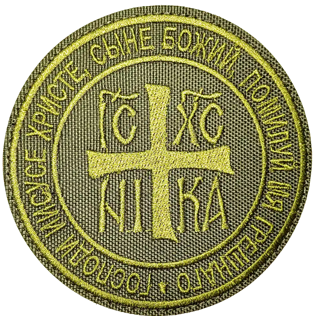 The Russian Orthodox Jesus Cross Patch 9cm is a round green-gold insignia embroidered with a cross and the letters IC XC NIKA (Jesus Christ Conquers). Around the border is a prayer inscription in Church Slavonic: “Иисусе Христе, Сыне Божий, помилуй нас грешных.”