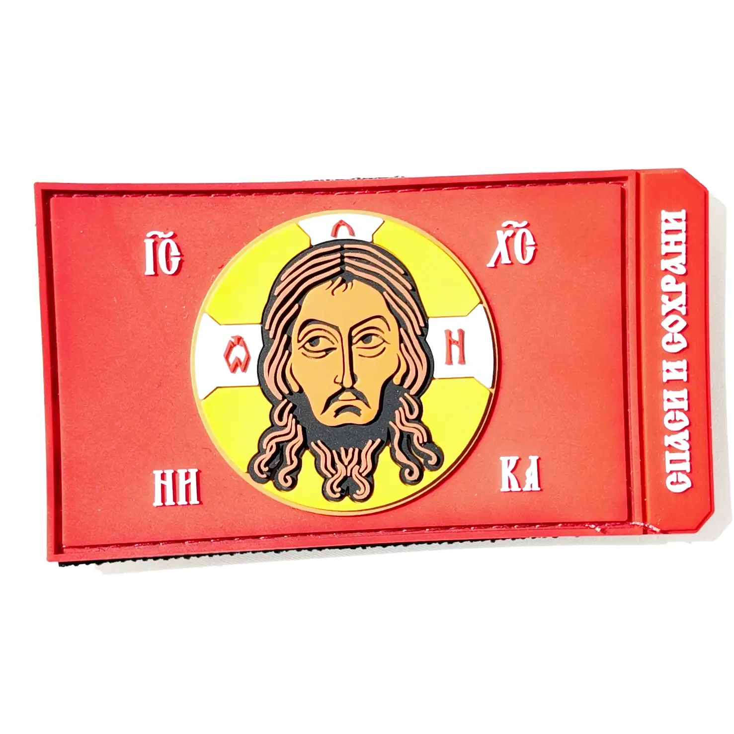 This PVC patch depicts the revered Holy Mandylion (Spas Nerukotvorny), the “Image Not Made by Hands,” placed at the center of a bright red background and surrounded by traditional Church Slavonic inscriptions (IC XC, НИ КА) as well as the prayer “Спаси и Сохрани” (“Save and Protect”) written vertically along the edge.