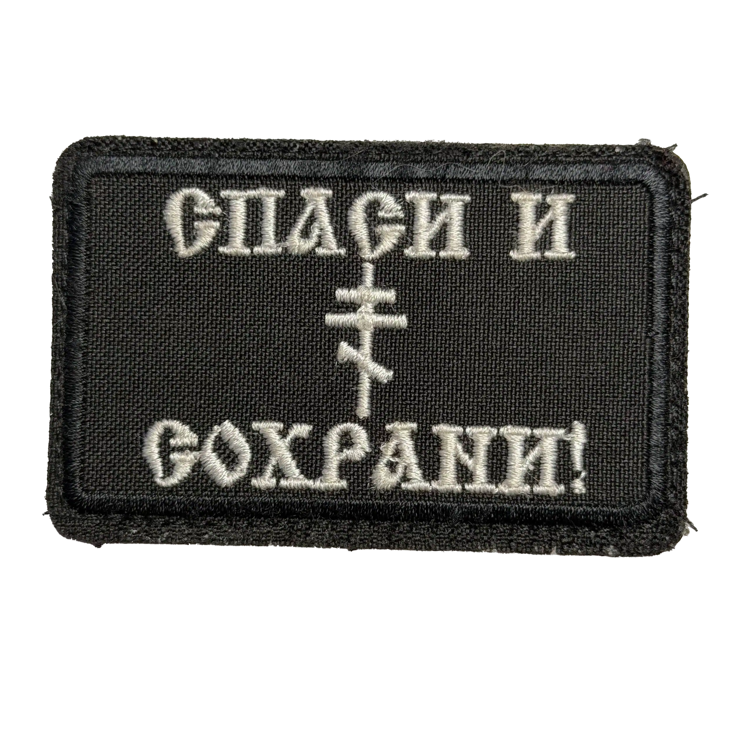The upper Cyrillic text reads “Спаси и,” and the lower text reads “Сохрани.” Translated into English, the phrase means “Save and Protect.” The wording and cross symbol are presented exactly as visible on the patch, without added elements, unit identifiers, or numeric designations.