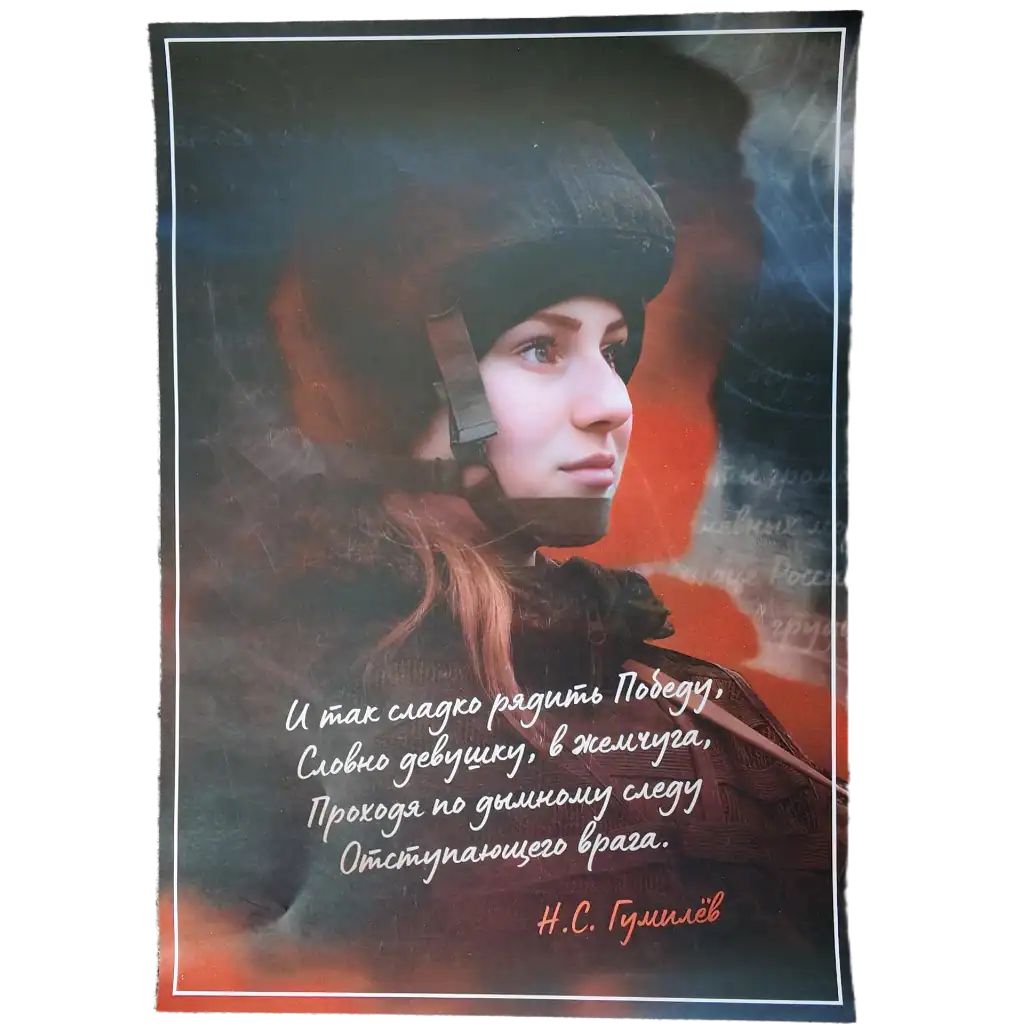 This Russian Patriotic Poster Female Soldier blends military strength with poetic elegance. The poster showcases the image of a young Russian woman in combat uniform, overlaid with a powerful wartime verse by renowned poet Nikolay Gumilyov: