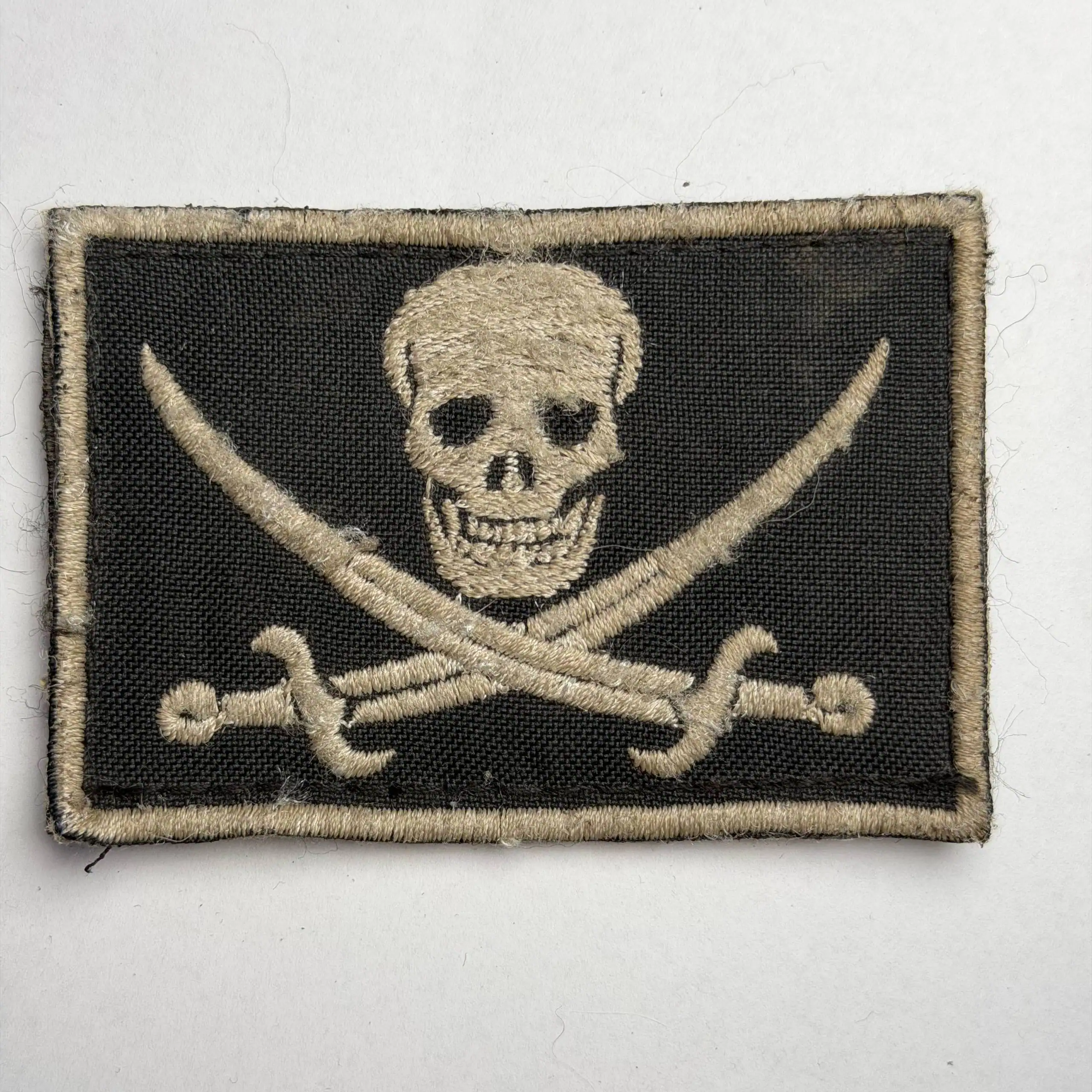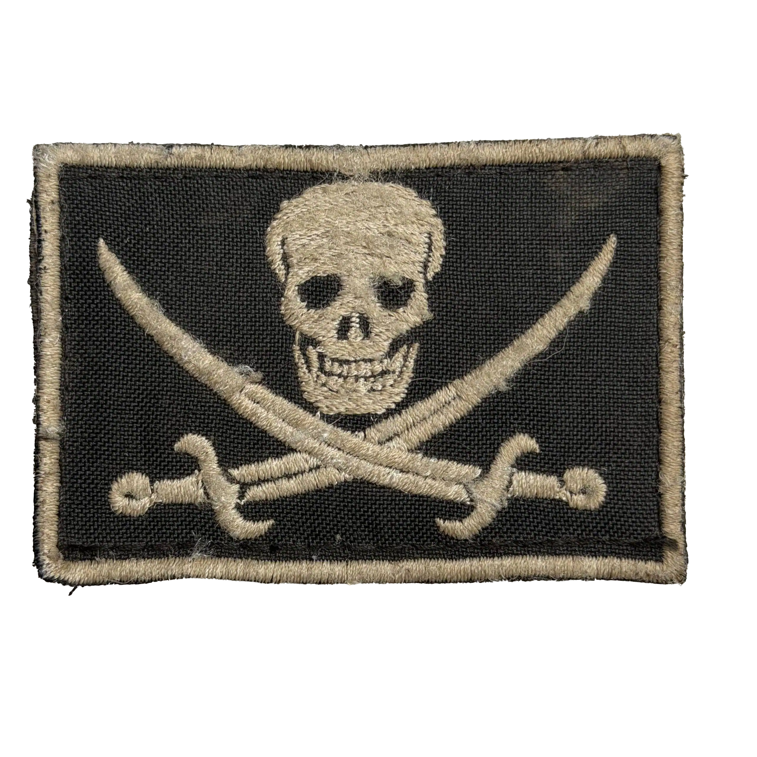 Russian Pirate Head Trophy Patch embroidered on a rectangular black textile base with a light stitched border. The central motif shows a skull positioned above two crossed curved sabers, rendered in light thread. The composition is symmetrical and framed by a stitched edge. Minor fraying, loose fibers, and surface wear are visible, consistent with field-used trophy gear textiles.