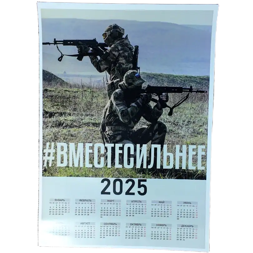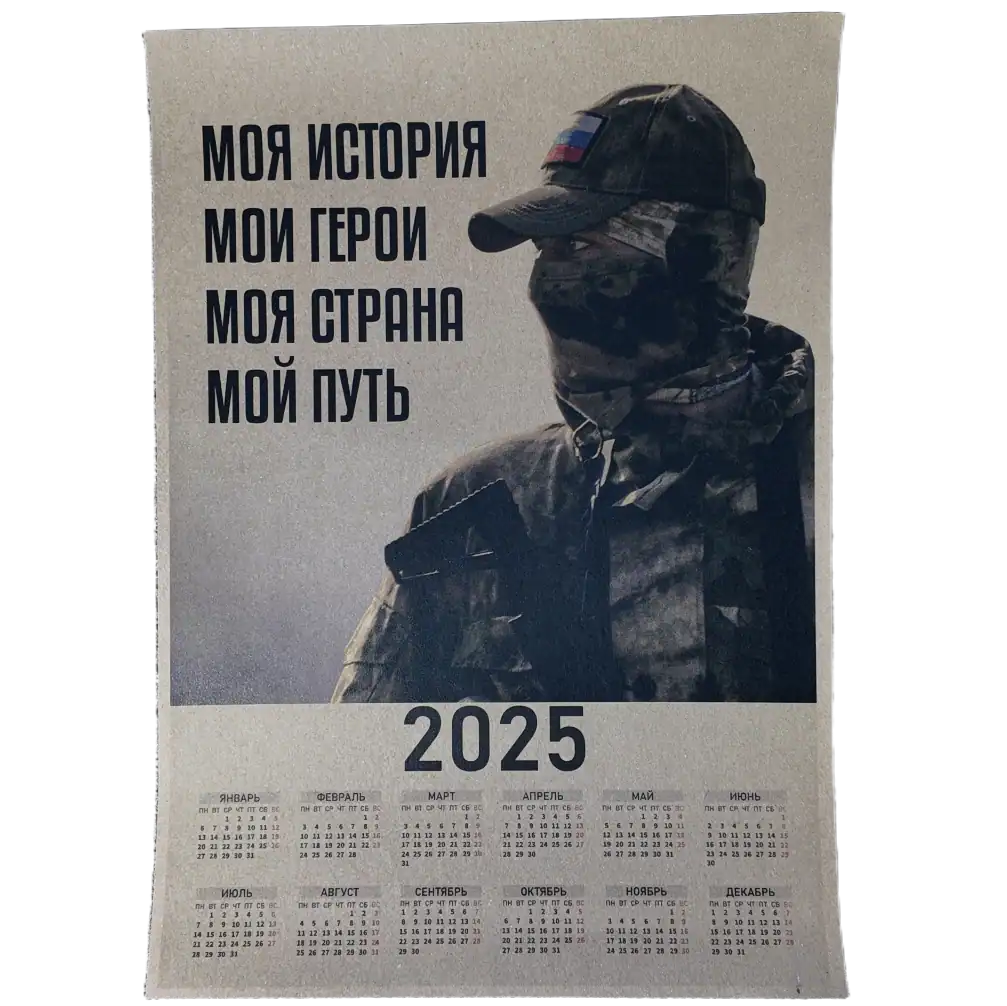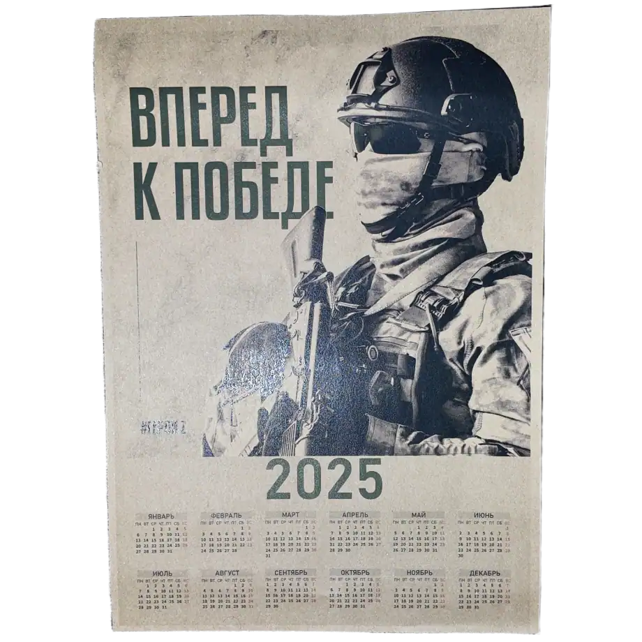 This 2025 calendar set features powerful imagery inspired by Russian patriotic and propaganda art. Modern soldiers, iconic military hardware (tanks, aircraft, artillery), and heroic compositions echoing wartime posters and nationalistic themes.