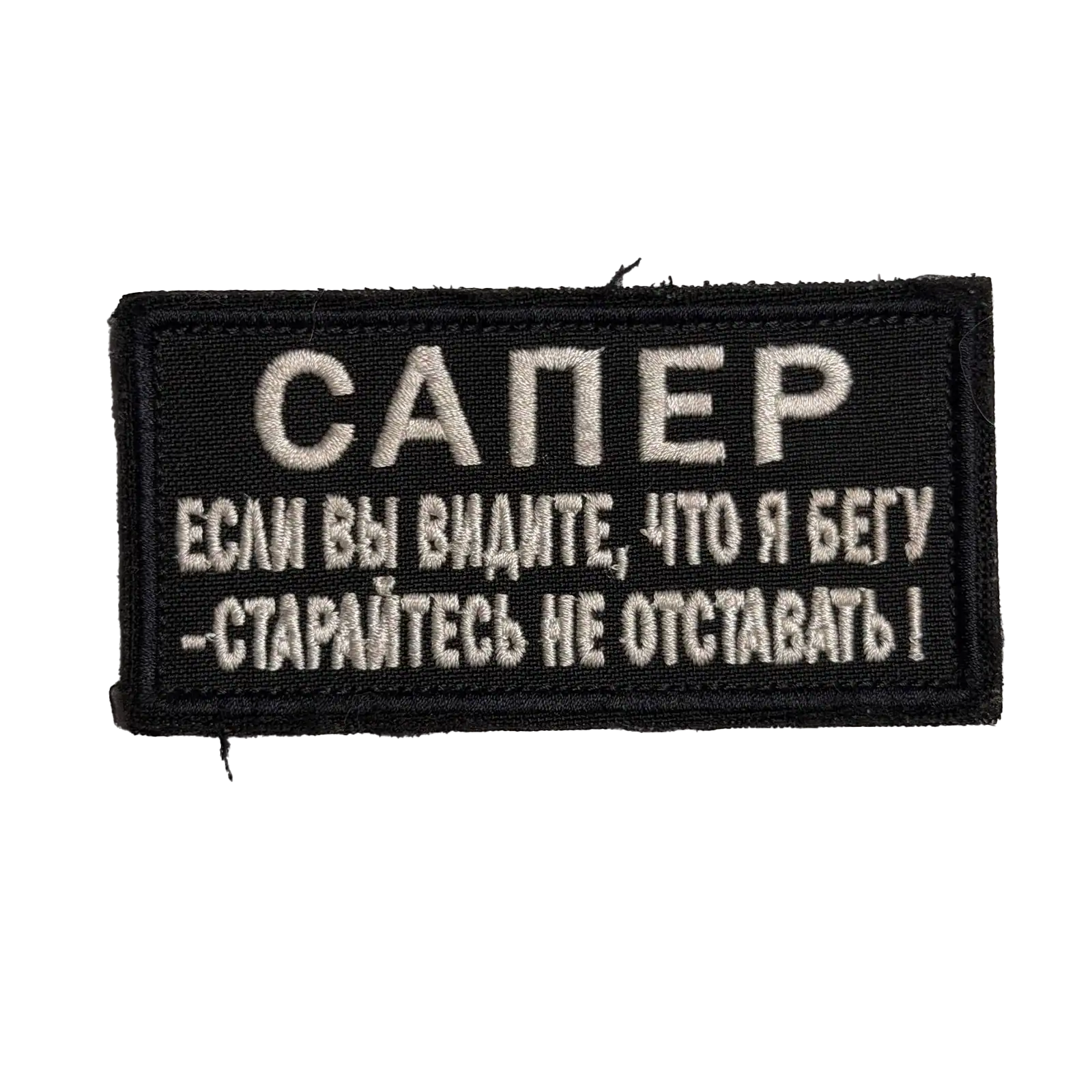 Russian Sapper Warning Morale Patch Trophy is a black rectangular embroidered insignia associated with combat engineer units. The patch features a bold white Cyrillic inscription designed for immediate recognition in field conditions and informal troop use.