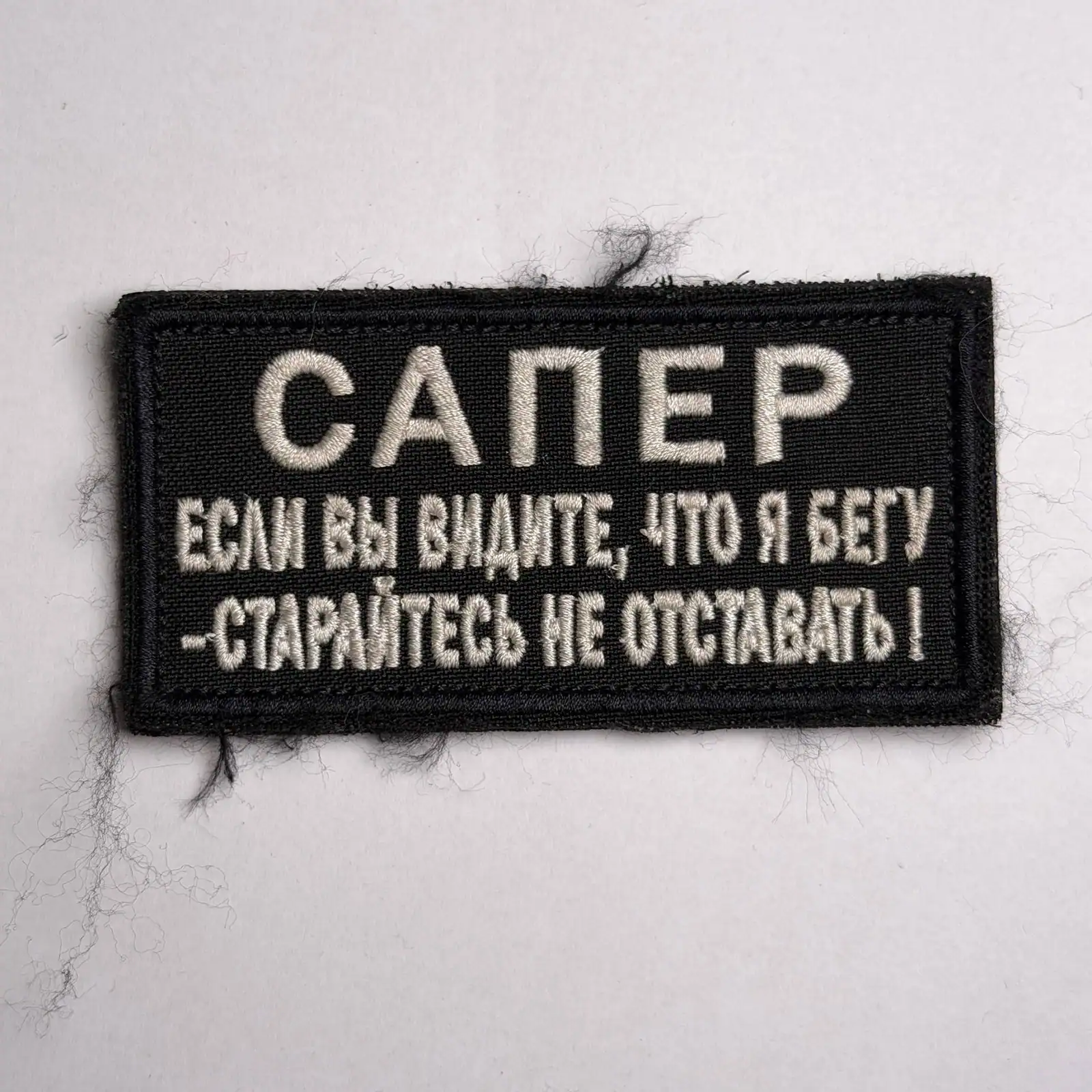 The visible text reads “САПЕР” followed by a warning phrase commonly used among sappers. Translated meaning: “Sapper. If you see me running, try not to keep up.” The original wording contains coarse language; the translation is intentionally censored while preserving the meaning.