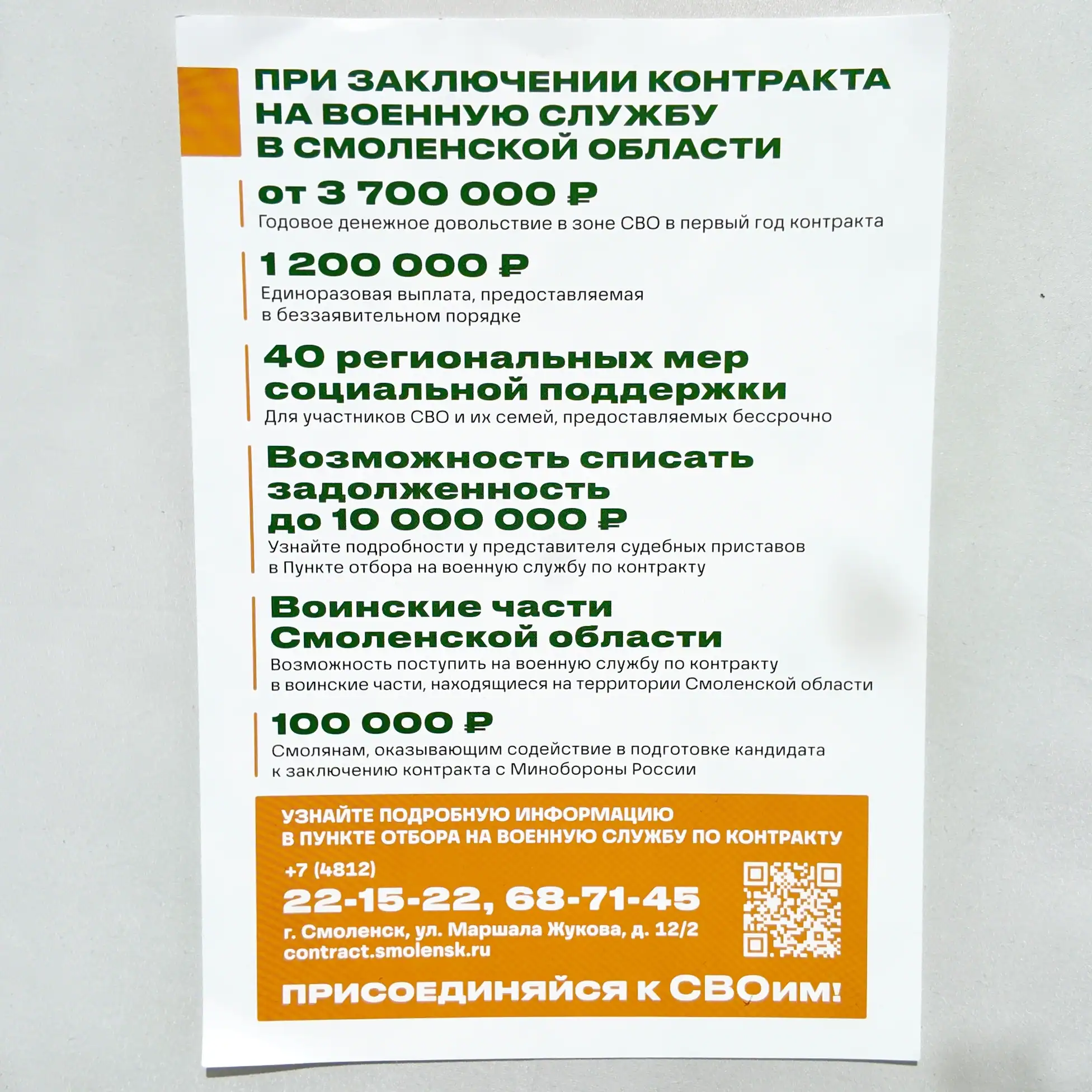 Official propaganda leaflet issued in Smolensk Oblast to promote contract military service during the Special Military Operation (SMO). This Ukraine war enlistment leaflet offers massive financial incentives and long-term social benefits for those who enlist under contract.