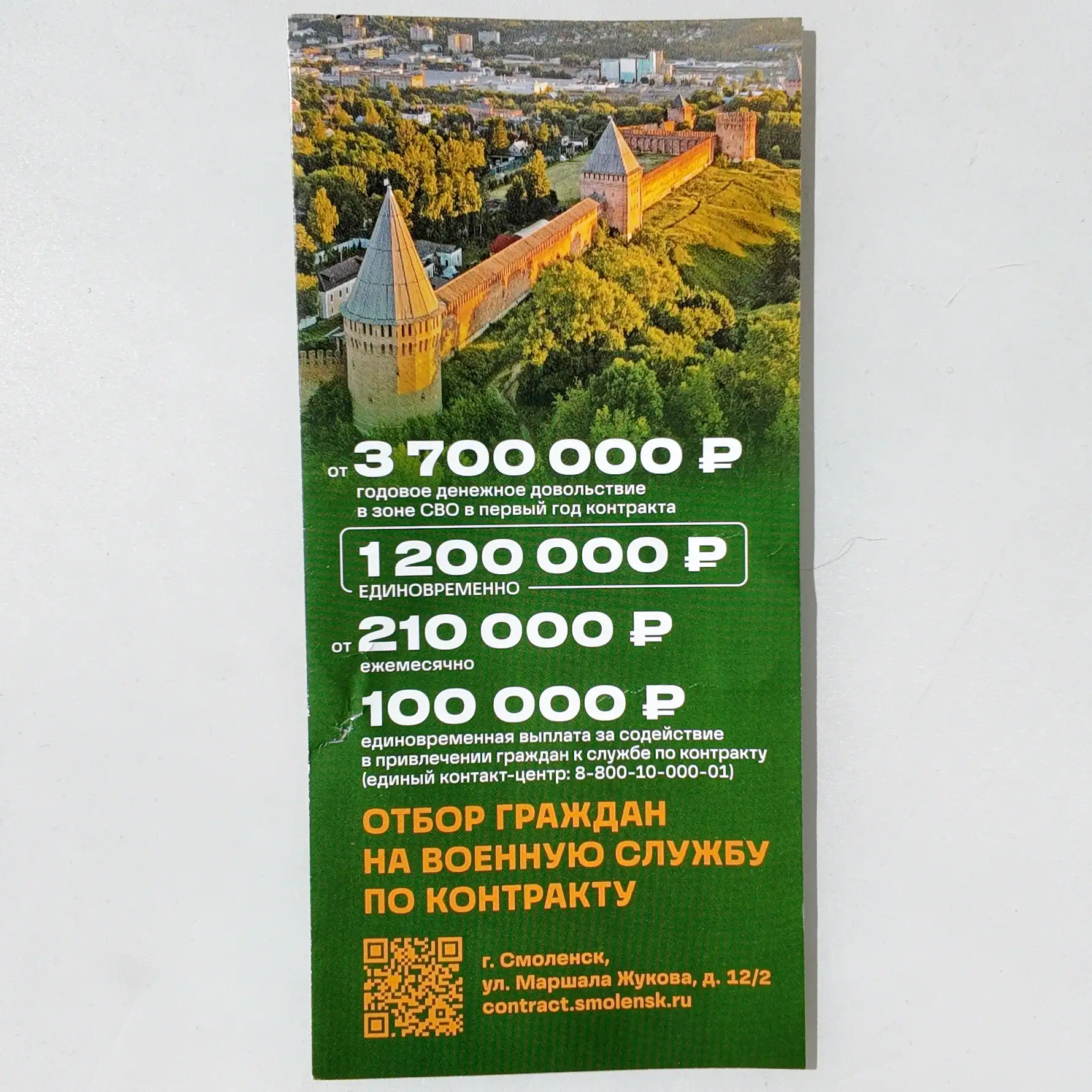 Original tri-fold propaganda brochure issued in 2023 by the Russian Ministry of Defense. Designed to boost contract military enlistment during the Ukraine war, the booklet promises financial rewards, career pathways, and fast-track benefits for both citizens and foreign recruits.