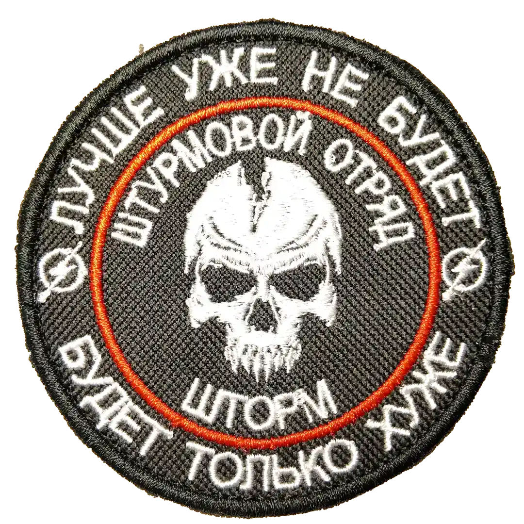 The Russian Storm Z Convicts Patch 8cm is a round black patch with a central skull emblem and white embroidered text. The inscriptions read: “Лучше уже не будет, будет только хуже” (It won’t get better, it will only get worse) and “Штурмовой отряд Шторм” (Storm Assault Squad). The design is framed with a red border.