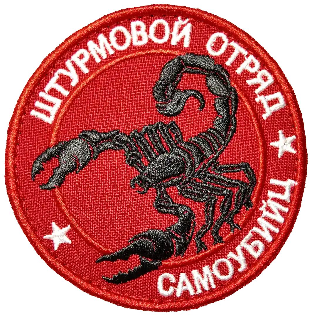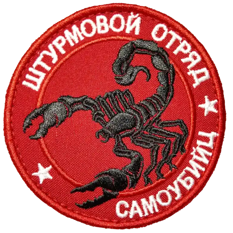 The Russian Suicide Squad Assault Patch 8cm is a round red insignia featuring a black embroidered scorpion and the words “Штурмовой отряд самоубийц” (Suicide Assault Squad). This patch is directly associated with Russian assault formations deployed during the war in Ukraine.