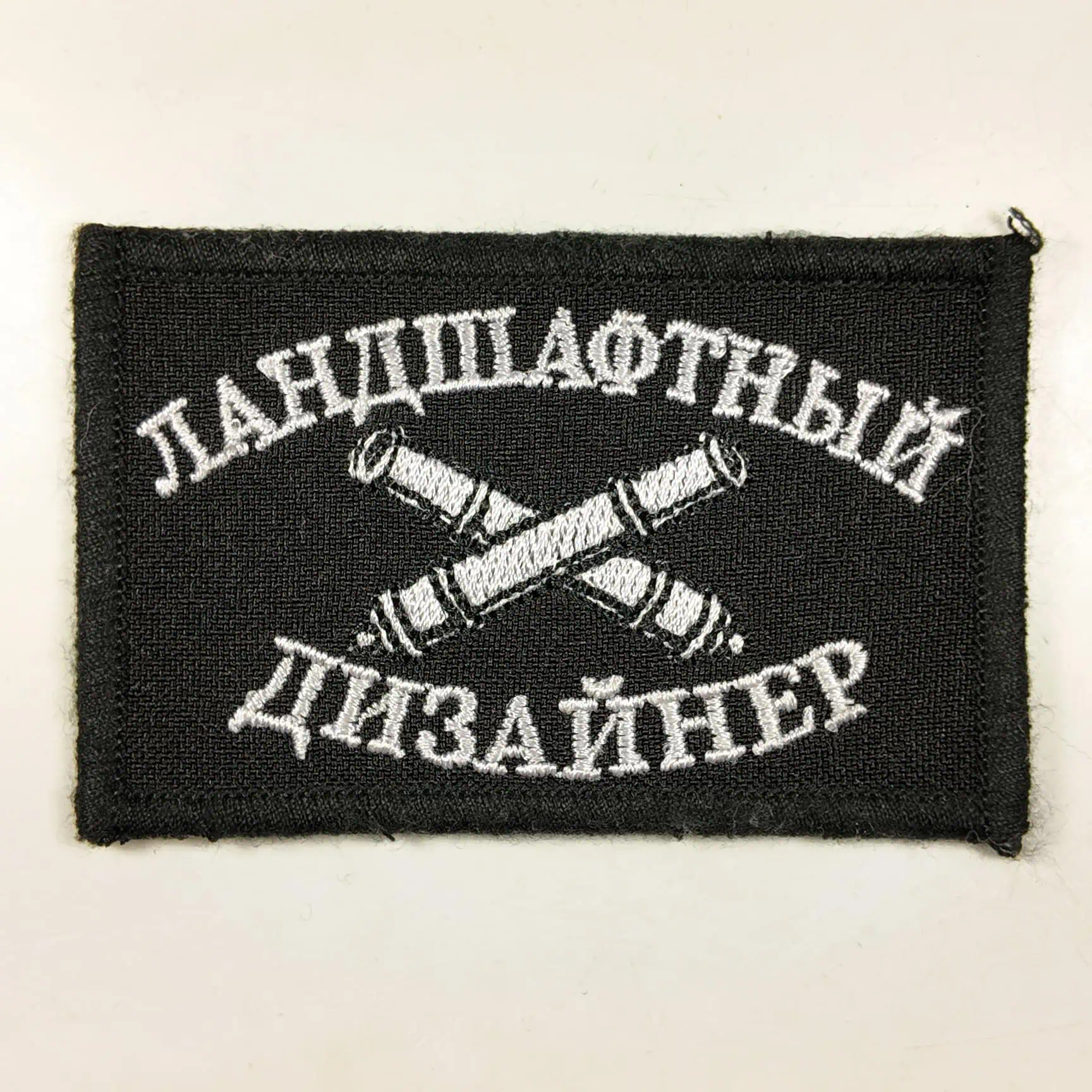 This patch stands out with its witty inscription “Ландшафтный Дизайнер,” accompanied by a design of crossed artillery shells, symbolizing artillery and explosive impact. Made on a black background with white embroidery, it appeals to military humor and camaraderie, often associated with artillery units and enthusiasts.