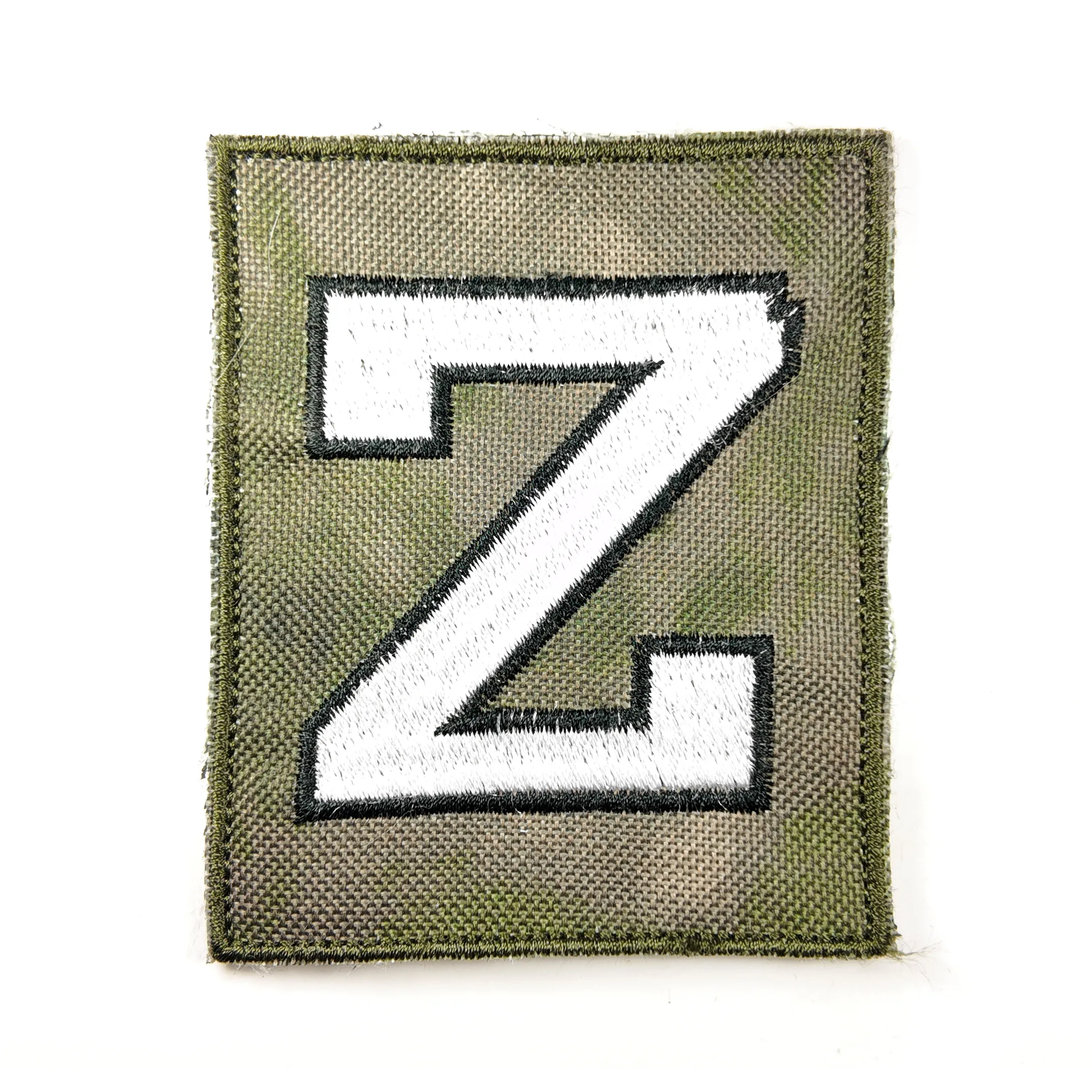 A camouflage velcro patch featuring a large embroidered “Z” in white, outlined with black thread. The base is made from durable material with a camouflage background, making it suitable for tactical gear, military uniforms, and accessories.