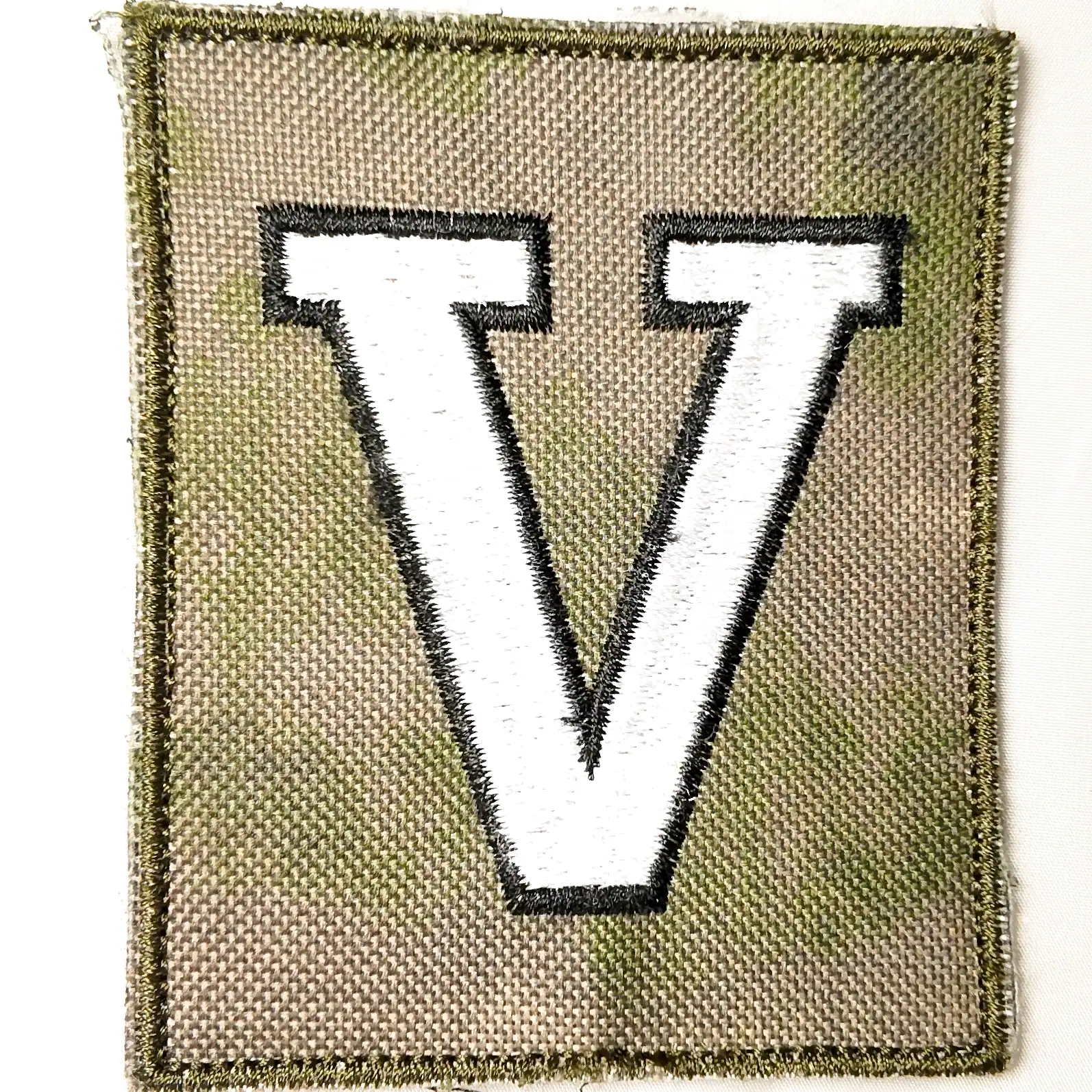 Is a modern field insignia adopted by the Russian armed forces for unit identification in operational environments. The patch displays a prominent white “V” with black outline on a camouflage background. Designed for quick and reliable recognition, this badge is used by military personnel and special units during joint actions and field maneuvers.