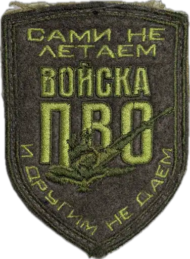 The Russian text on the patch reads “Войска ПВО” and “Сами не летаем и другим не даем.” Translated into English, this means “Air Defense Forces” and “We don’t fly ourselves and we don’t let others.” The phrase is a well-known informal saying traditionally associated with air defense units, emphasizing their role in denying airspace rather than operating aircraft. In this context, the wording functions as branch-specific humor and identity expression rather than a tactical statement.