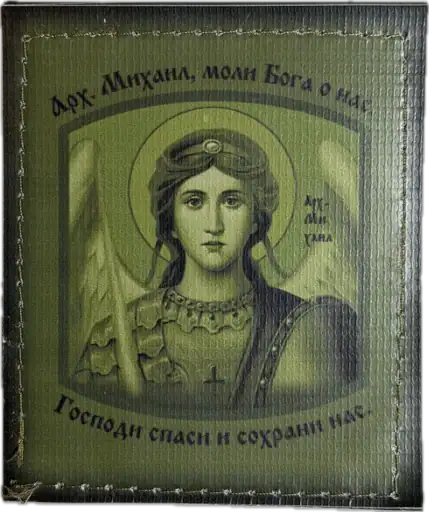 The text on the patch refers to Archangel Michael, who in Orthodox tradition is regarded as a heavenly protector and leader of angelic forces. Translated into English, “Архангел Михаил” means “Archangel Michael.” In this context, the imagery and wording function as a symbolic invocation of protection and moral strength rather than a doctrinal statement or operational message.